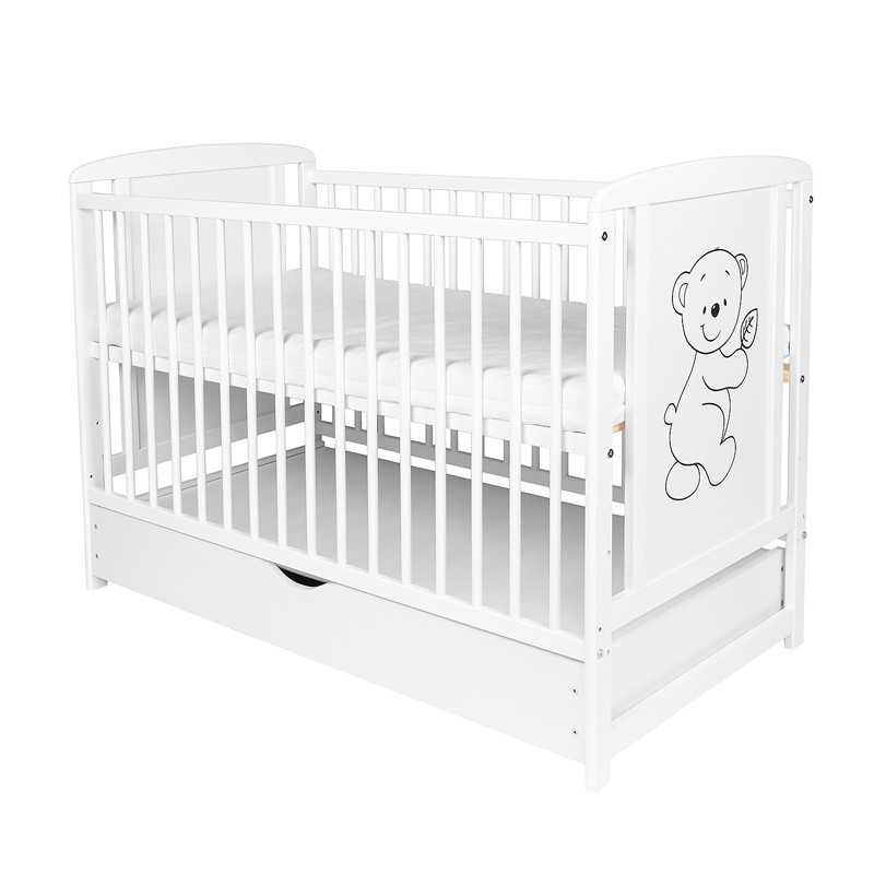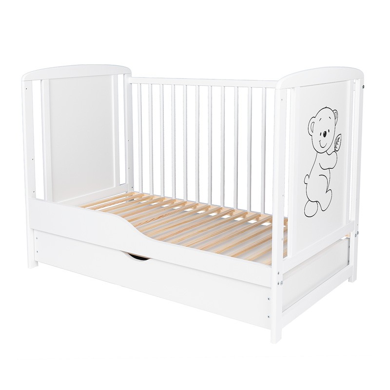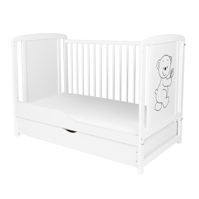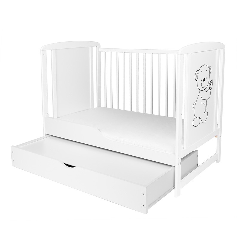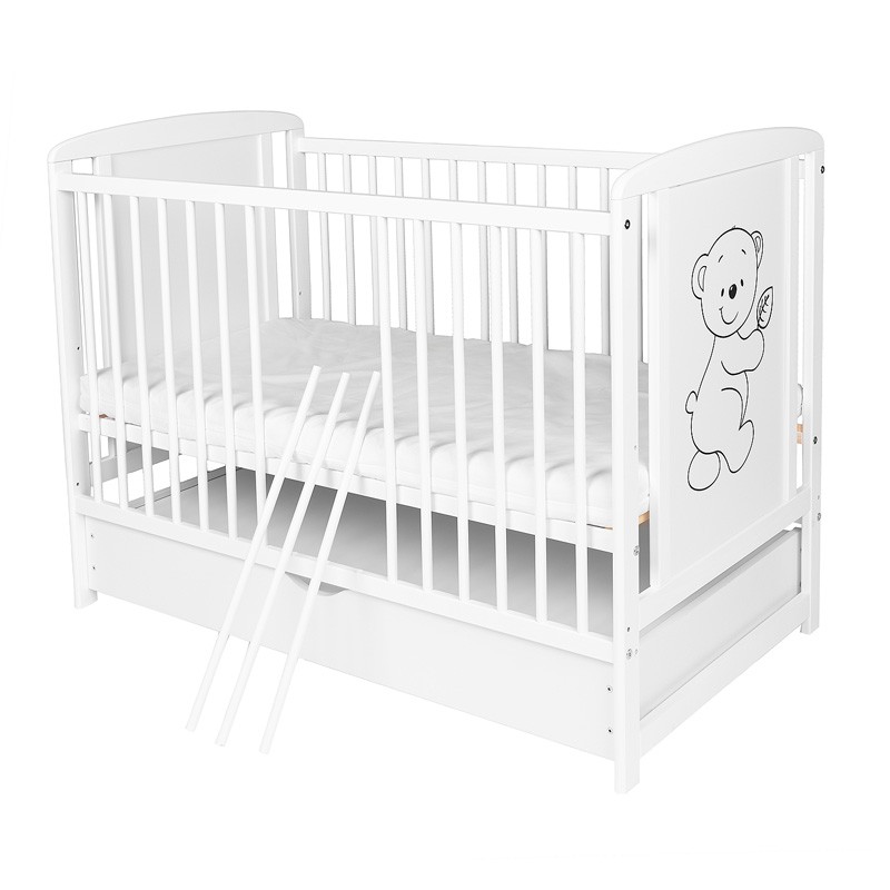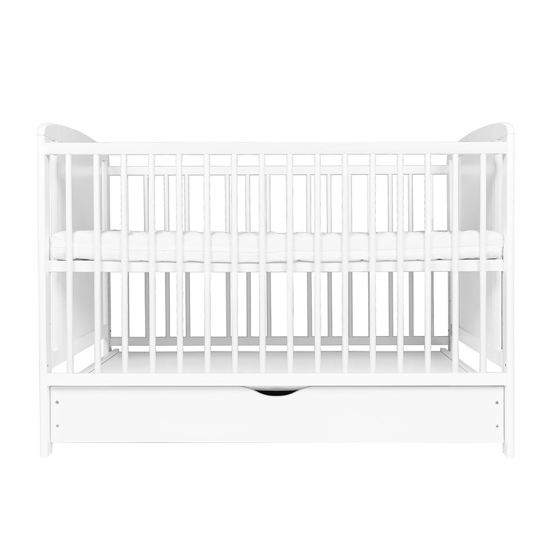 Dětská postýlka je navržena pro každodenní použití v dětském pokoji. Konstrukce z borovicového dřeva 1. třídy, třípolohové nastavení dna a 3 vyjímatelné tyčky umožňují přizpůsobit postýlku aktuálním potřebám dítěte. Spodní zpevňující lišta je uzpůsobena pro montáž zásuvky, takže postýlku lze doplnit o praktický úložný prostor. Postýlka je k dispozici v bílé barvě a je určena pro matraci o rozměru 120 x 60 cm. Důraz na zpracování podporuje estetický vzhled a pohodlné používání.