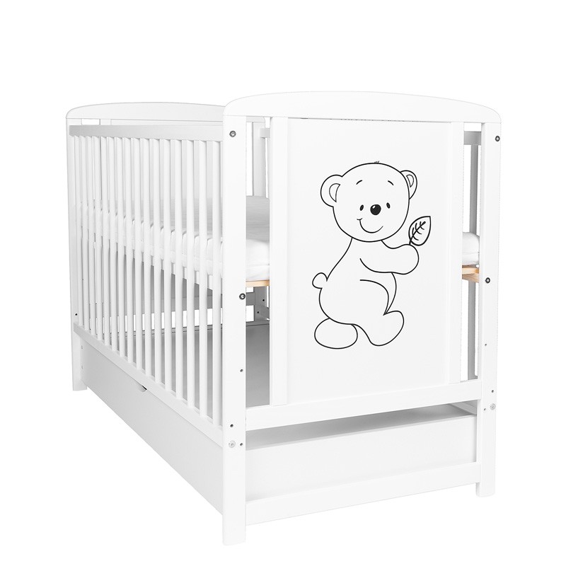 Postýlka je dostupná v bílé barvě, která se snadno kombinuje s různými interiéry dětského pokoje. Bílý odstín dobře ladí s jemnými i výraznějšími doplňky. Potisk na HDF desce může zobrazovat žirafu nebo medvídka, což dodává postýlce dětský charakter. Jednoduchá forma a neutrální barva umožňují postýlku použít v klasickém i moderním prostředí a snadno ji sladit s ostatním nábytkem a textiliemi.