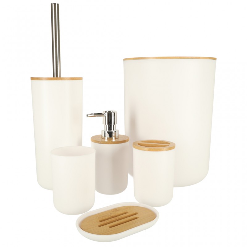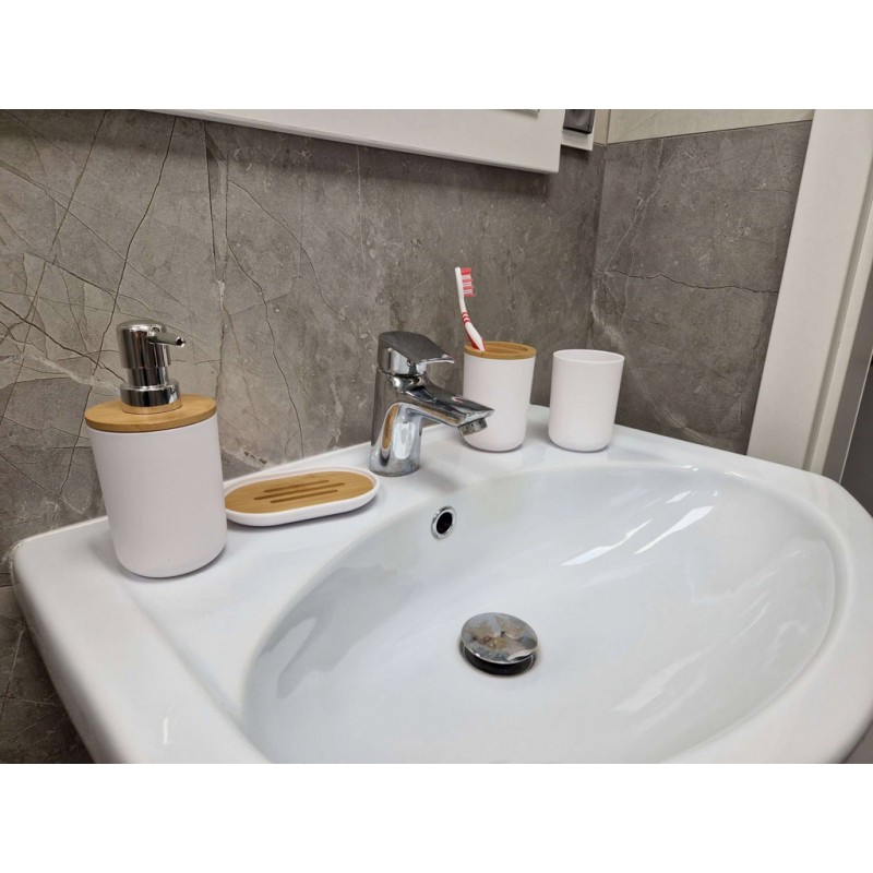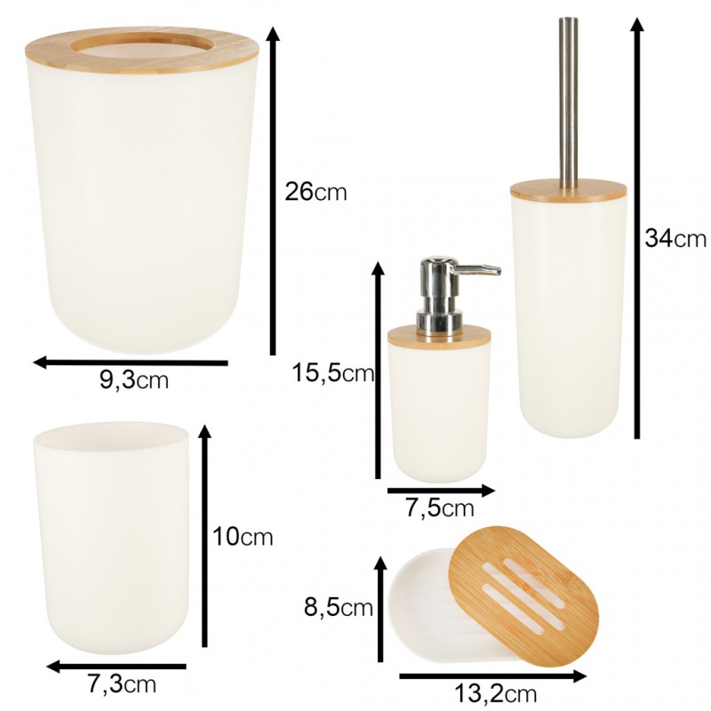 Postarejte se o jednotný vzhled a funkčnost své koupelny. Tato elegantní sada doplňků kombinuje minimalistický design s praktickými řešeními - od nádob a mýdlenky až po odpadkový koš. Dřevěné detaily dodávají každému interiéru přirozený charakter a teplo.