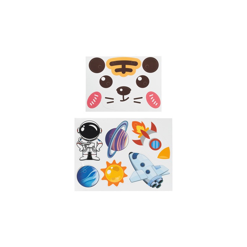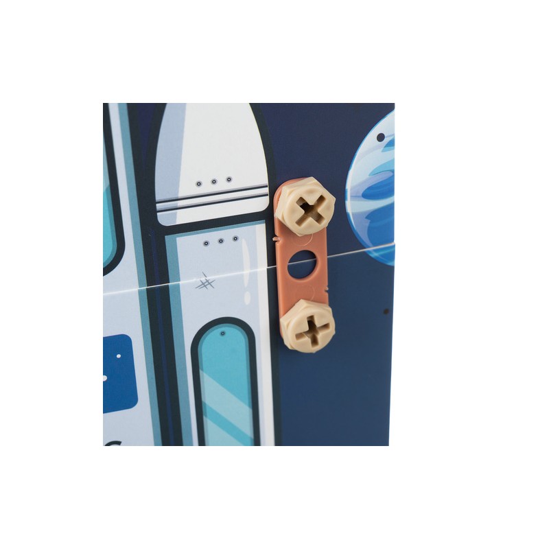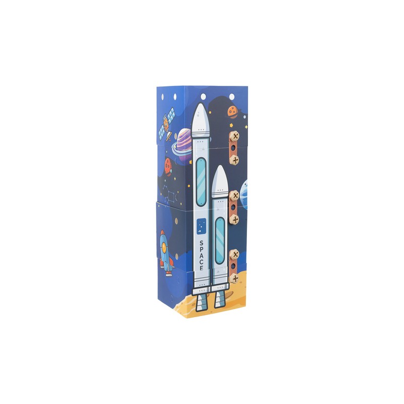 Stavebnice je laděna do vesmírného stylu – rakety, planety, postavička astronauta a motivy na montážních kartách vytvářejí atmosféru kosmické výpravy. Barevné vzdělávací prvky pomáhají dětem trénovat rozlišování barev, tvarů a skládání vlastních konstrukcí. Medvídková krabice dodává celé sadě hravý, dětem blízký vzhled.