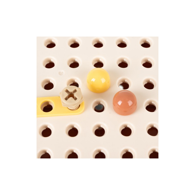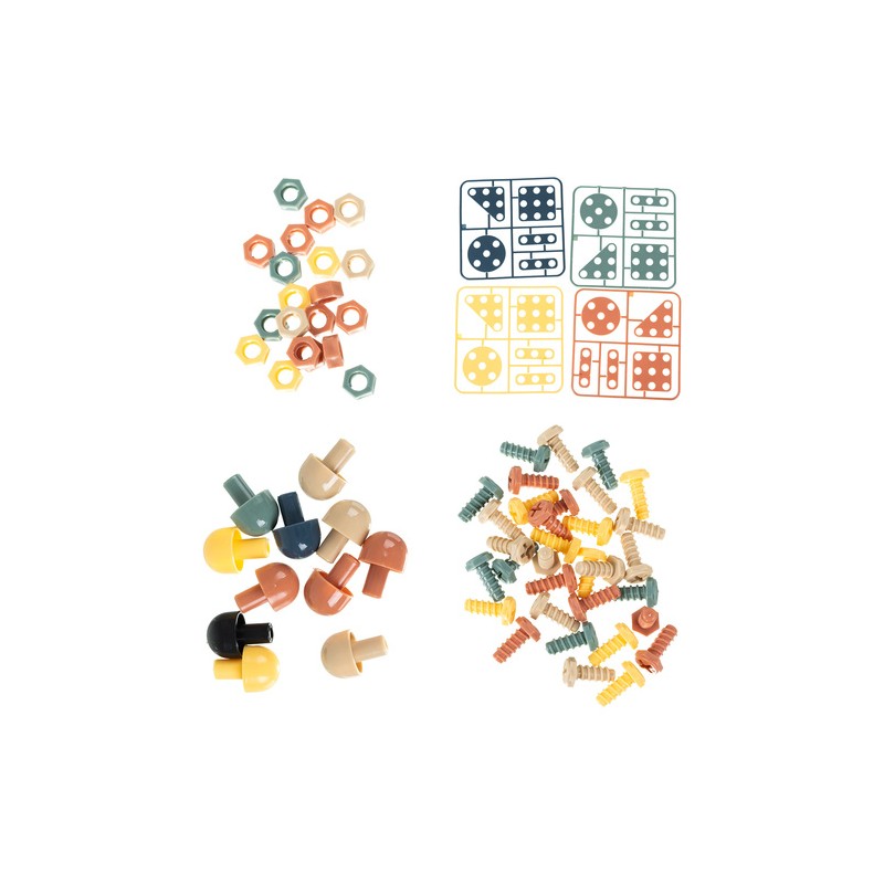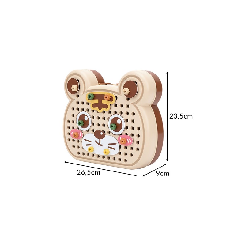Díly stavebnice jsou vyrobeny z odolného plastu, který je snadno udržovatelný v čistotě. Elektrická obousměrná vrtačka a ruční šroubovák jsou přizpůsobeny dětským rukám, plastové šroubky, matičky a barevné kolíky byly navrženy s ohledem na vzdělávací funkci. Krabice ve tvaru medvídka slouží jako montážní deska i praktická nádoba pro uložení všech částí po skončení hry, což usnadňuje pořádek a přenášení stavebnice.