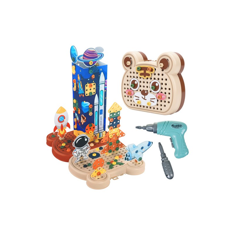 Stavebnice 3D Kosmos je vzdělávací sada 161 dílů s elektrickou aku vrtačkou, barevnými prvky a montážními kartami s vesmírným motivem. Krabice ve tvaru medvídka slouží jako montážní deska i praktický box a zaoblené tvary v kombinaci se shodou s evropskými normami podporují bezpečnou, kreativní hru.