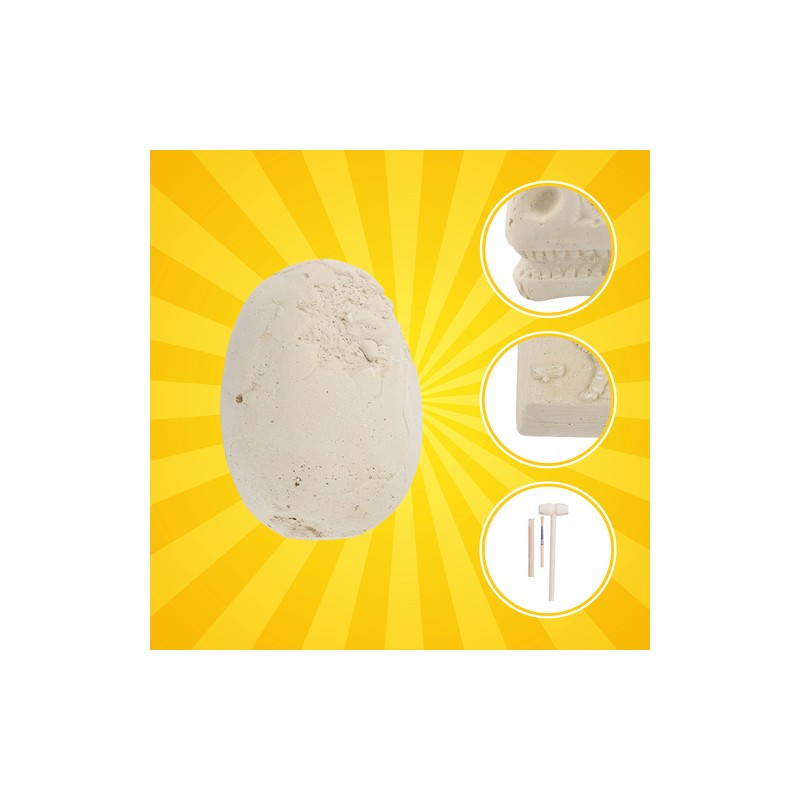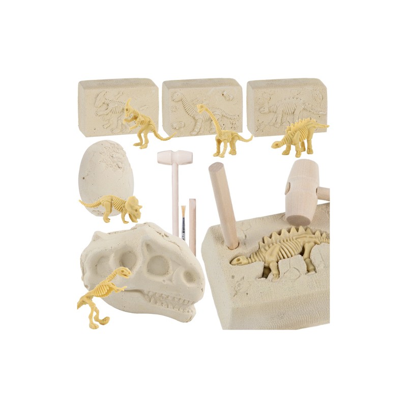 V sadě jsou 3 sádrové bloky, sádrové vejce a sádrová lebka dinosaura s ukrytými kostrami, doplněné dětem přizpůsobenými nástroji – kladívkem, dlátkem a štětečkem. Všechny díly jsou vyrobeny z bezpečných, netoxických, certifikovaných materiálů v souladu s evropskou normou, takže jsou vhodné pro dlouhou a soustředěnou hru. Konstrukce bloků a umístění koster jsou navrženy tak, aby děti mohly postupně odkrývat jednotlivé části a nakonec sestavit kompletní model dinosaura.