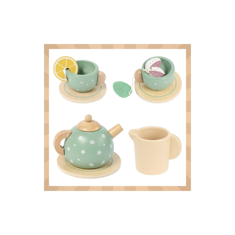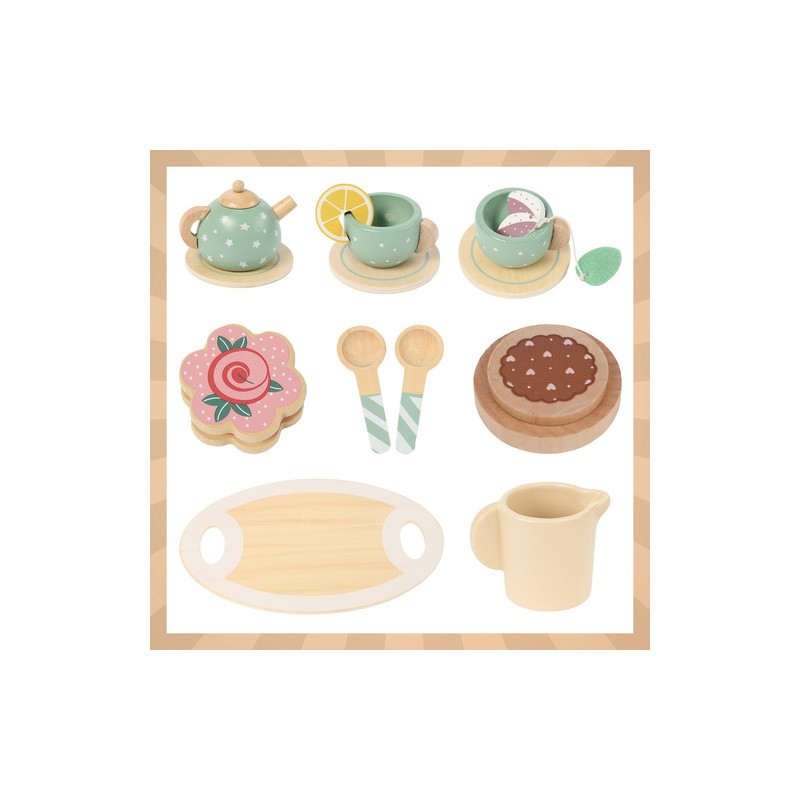 Kolik prvků sada obsahuje? Celkem je v balení 15 dřevěných dílů včetně konvičky, džbánku na mléko, šálků s podšálky, lžiček, plátku citronu, čajových sáčků, tácu s uchy, podnosu a dřevěných sušenek, muffinů a kousků dortu.