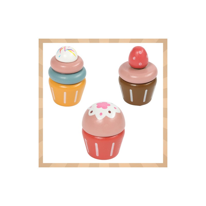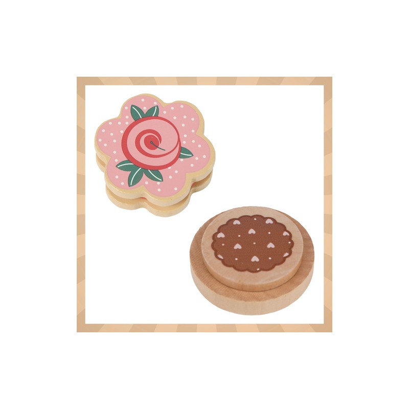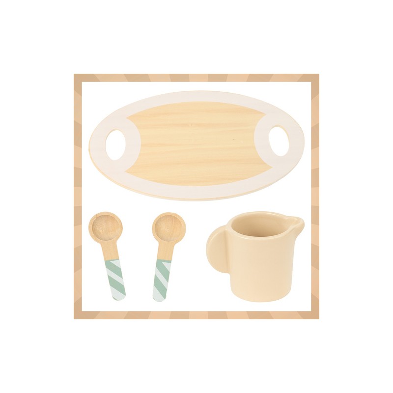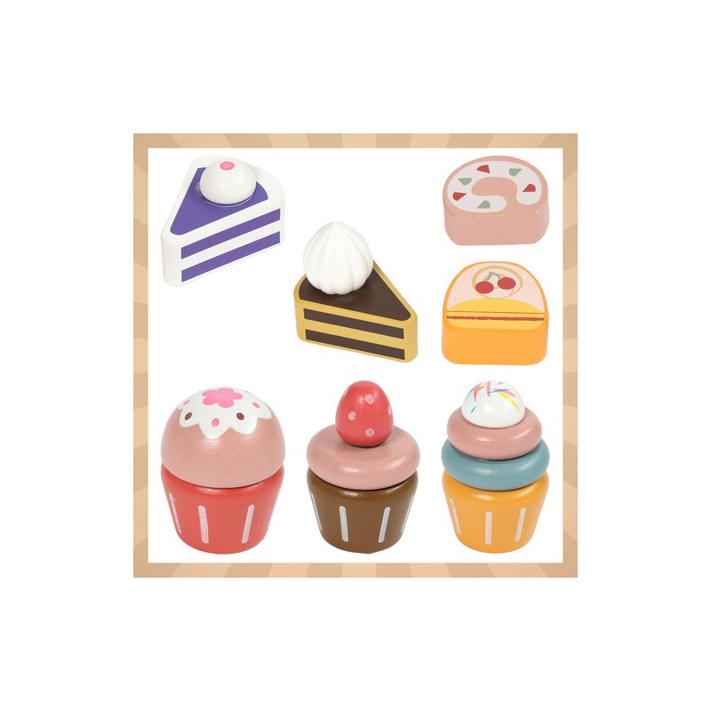 Sada je laděna do jemných pastelových barev, díky nimž dřevěné sladkosti vypadají jako skutečné dobroty. Detaily na muffinech, sušenkách a kouscích dortu připomínají dezerty z cukrárny a podněcují dětskou fantazii. Elegantní podnos a sladěná čajová souprava vytvářejí harmonický celek, který se pěkně vyjímá v dětském pokoji nebo herním koutku.