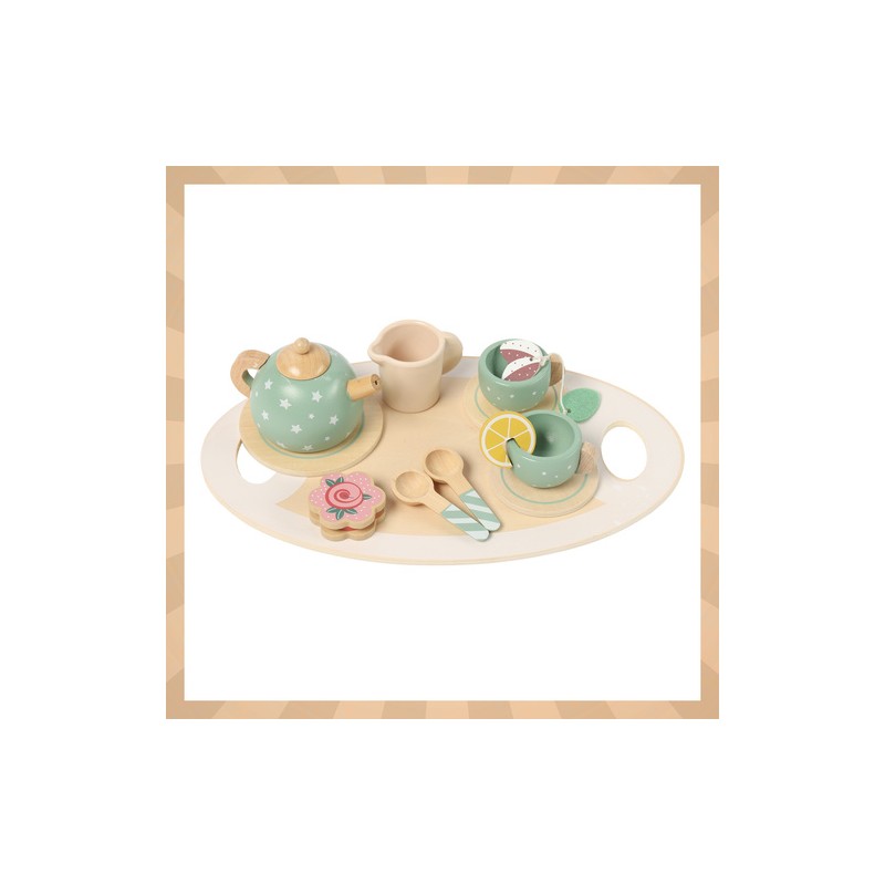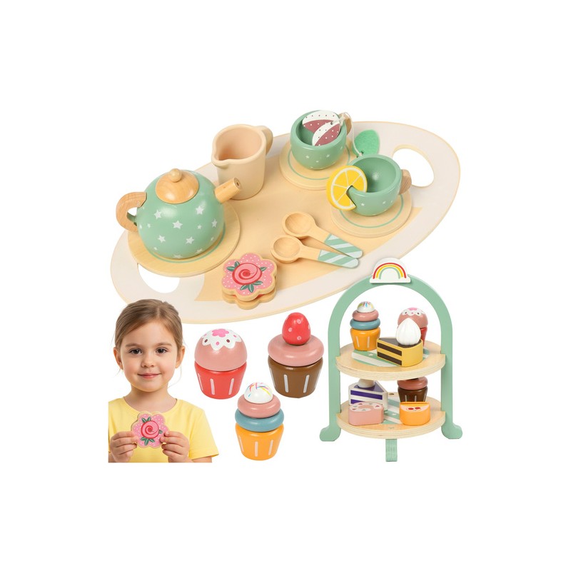 Dřevěná sada na čaj s podnosem promění každý den v malé slavnostní pohoštění. Děti mohou servírovat muffiny, sušenky a kousky dortu a hrát si na narozeniny, čajový dýchánek nebo vlastní cukrárnu. Hra podporuje kreativitu, spolupráci a dobré chování u stolu – učení probíhá formou hry, bez nepořádku po skutečných sladkostech.