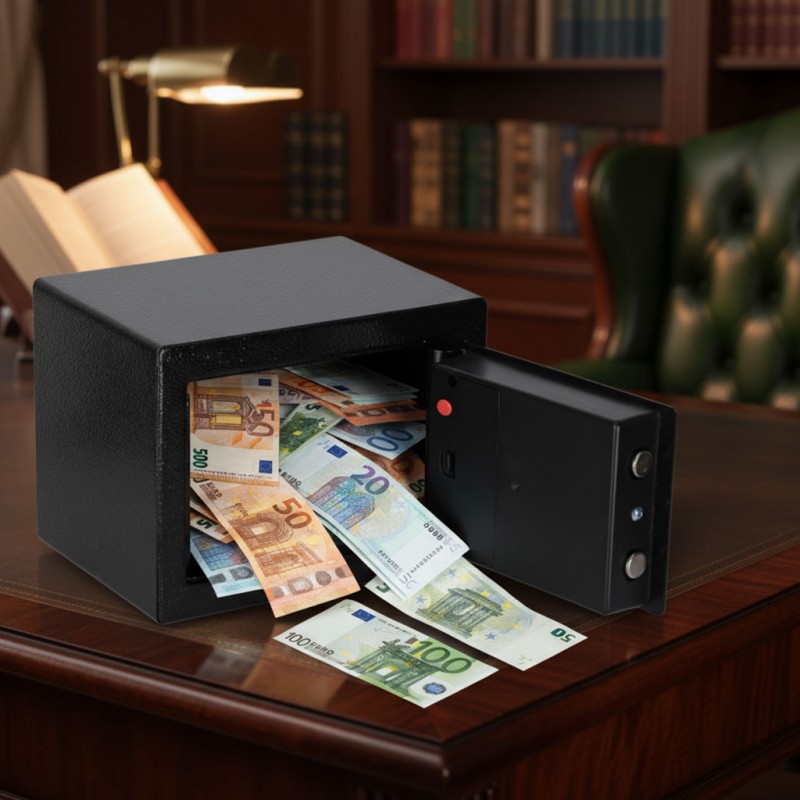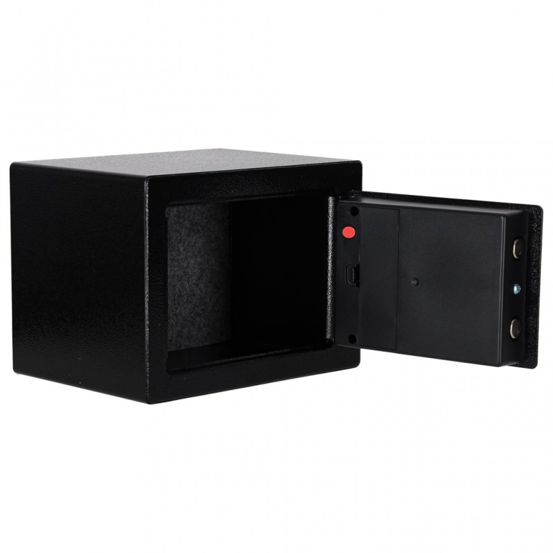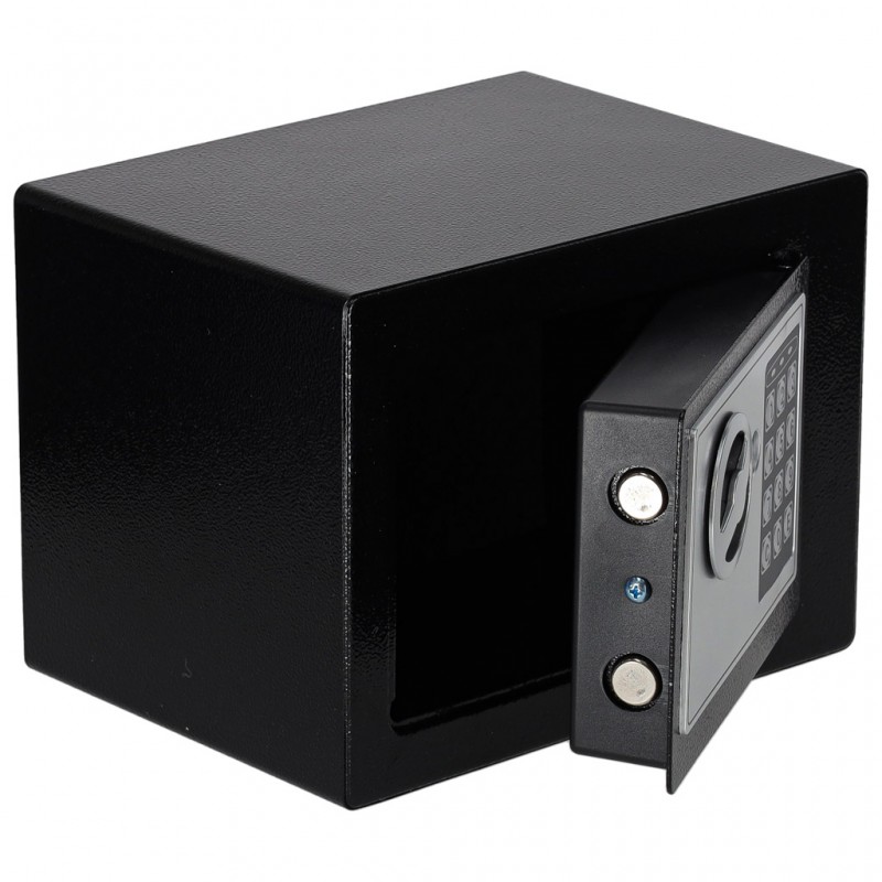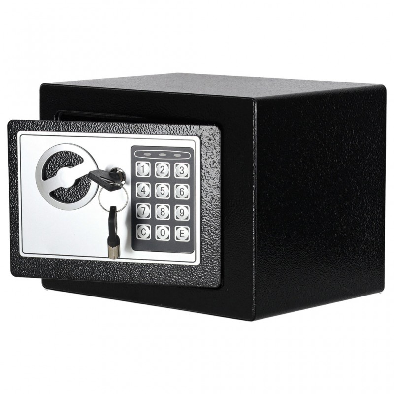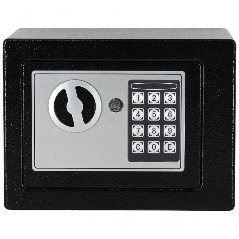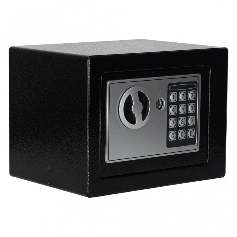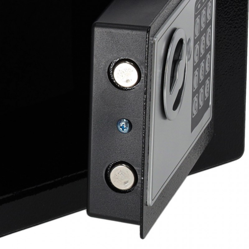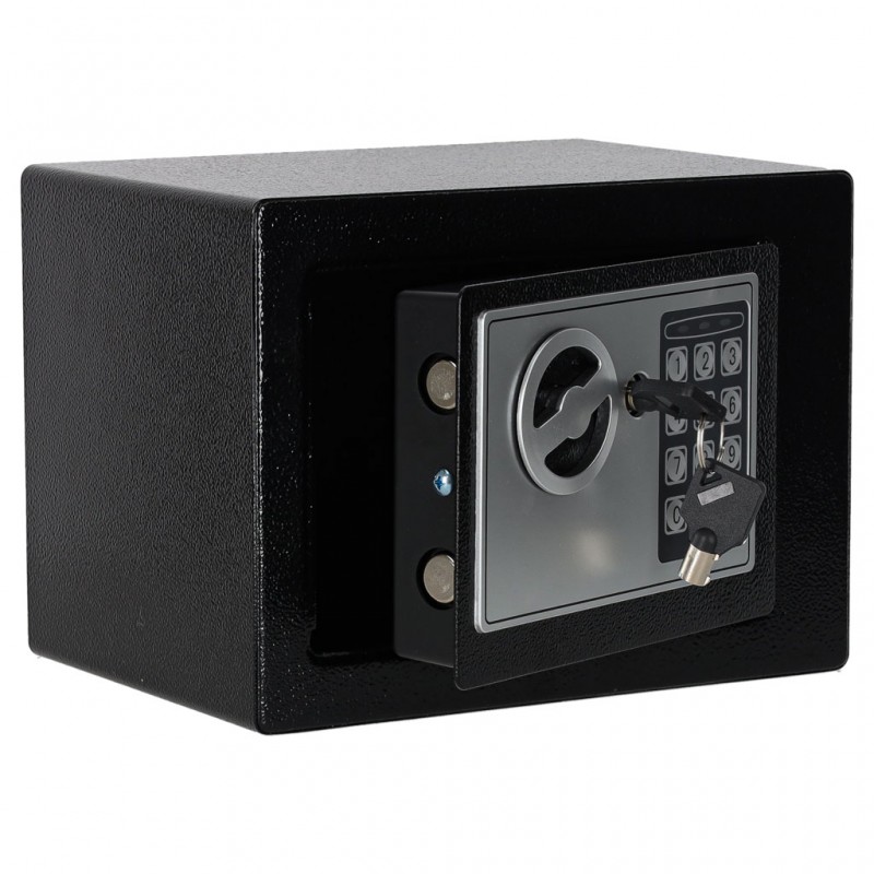 Praktický trezor uzamykatelný na heslo a klíč najde využití v kanceláři i v domácnosti. Dva způsoby otevírání komplexně chrání cennosti před neoprávněným přístupem. Uvnitř lze uchovávat bankovky, šperky, klíče a dokumenty formátu A5. Elektronický zámek s heslem o délce 3 až 8 číslic, kód skrytý při zadávání a světelné signalizace pomáhají zvýšit bezpečnost uložených předmětů.