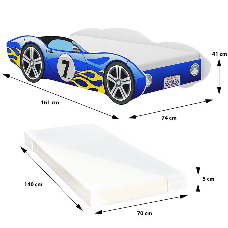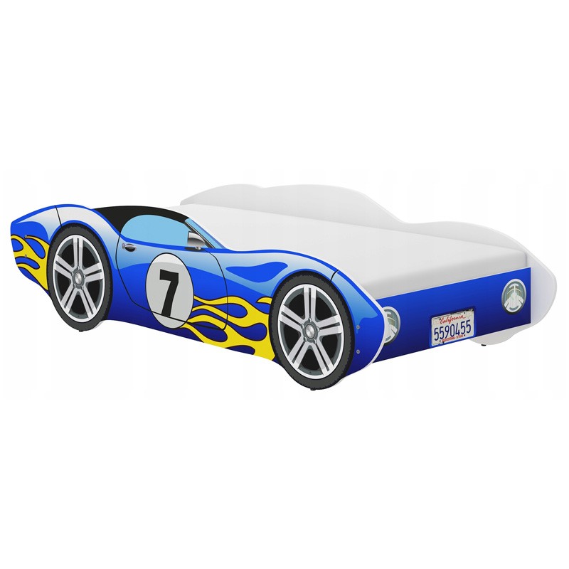 Modré provedení s plameny působí sportovně a tvar závodního auta dává dětskému pokoji výrazný, hravý charakter.