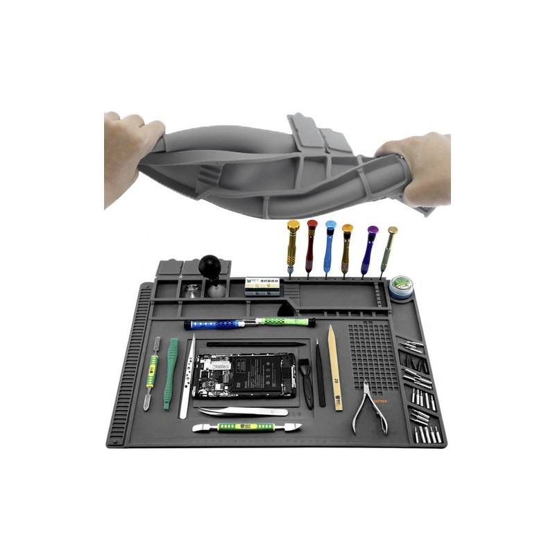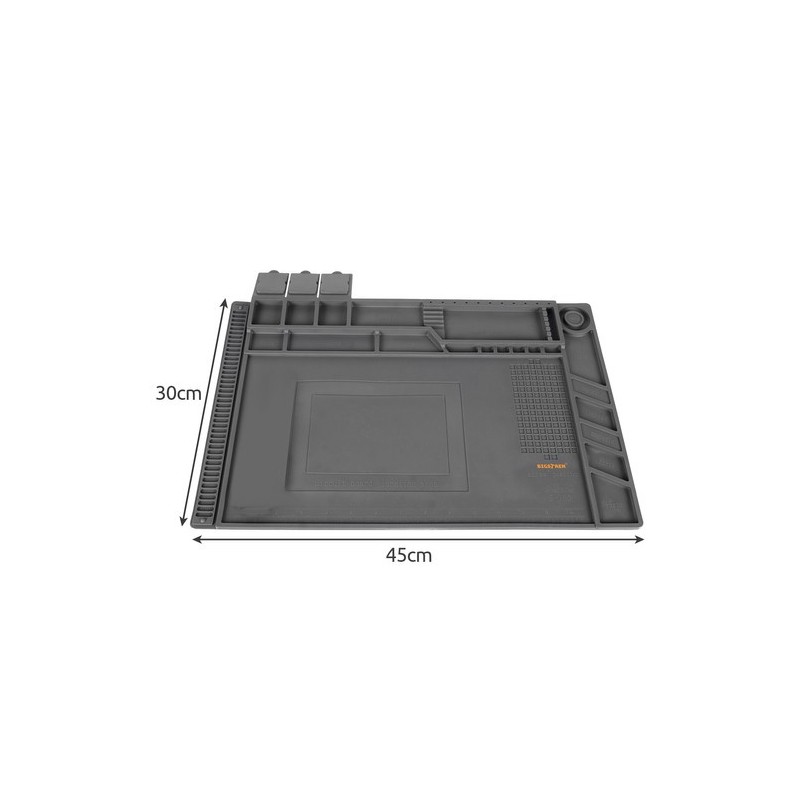 Tahle servisní podložka pomáhá garantovat pořádek na pracovním stole a šetří čas při opravách. Díky 4 magnetickým kapsám zůstanou šroubky a malé součástky na místě i při pohybu podložky. Tvarované zóny a přihrádky udrží věci přehledně oddělené, včetně prostoru pro odložení nářadí, takže se pracuje pohodlněji a rychleji. Měřicí linie a značení usnadňují přesné umístění dílů i kontrolu rozměrů. Podložka je odolná vůči vysokým teplotám, což se hodí při pájení a servisních pracích, a silikon je odolný vůči řadě chemických látek, takže se dá používat v různých prostředích bez obav z poškození.