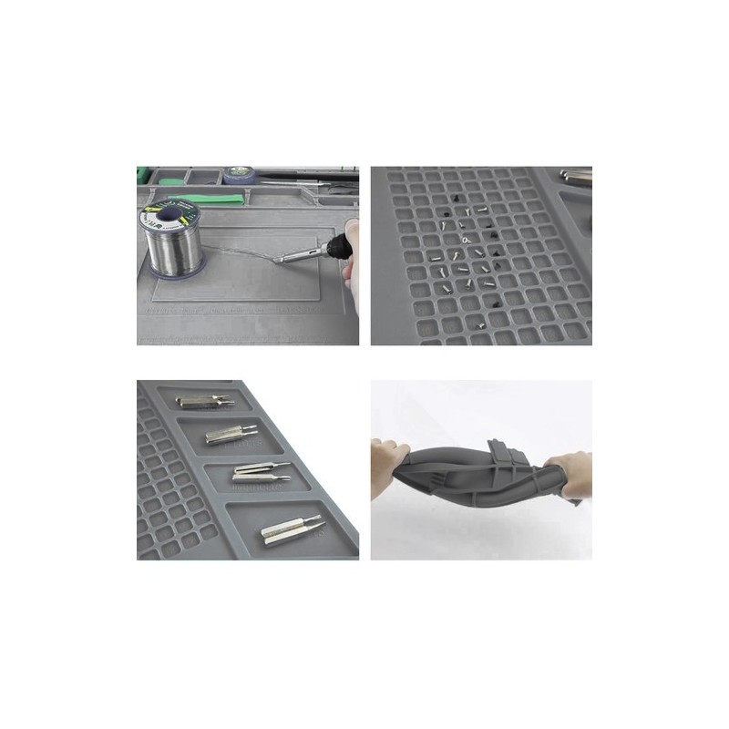 Silikonová servisní podložka se 4 magnetickými kapsami, přihrádkami a měřicími liniemi. Udrží šroubky a drobné díly na místě, zlepší organizaci nářadí a zrychlí opravy elektroniky i pájení.
