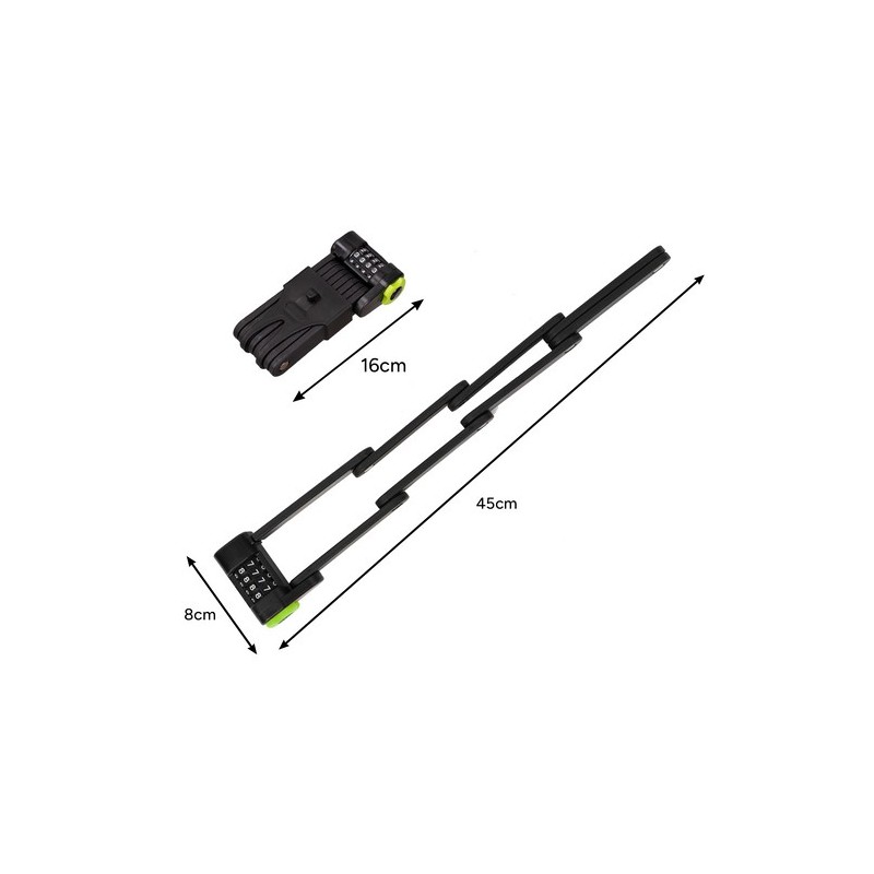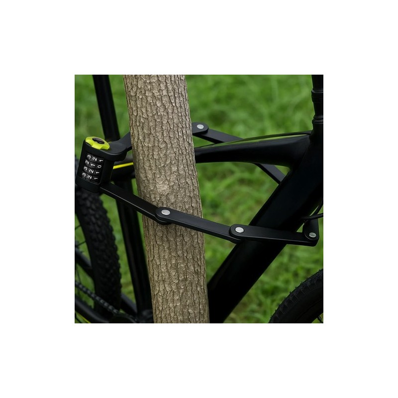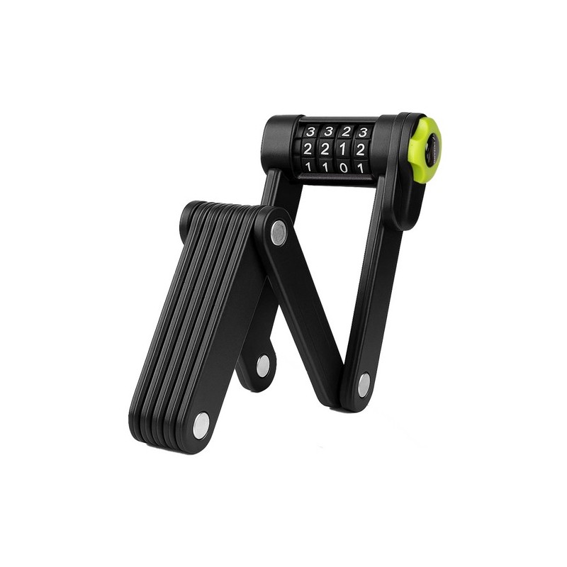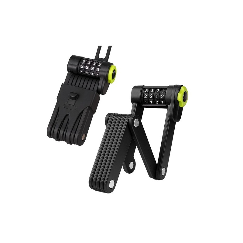 Skládací cyklo zámek z oceli se 4místným kódovým zámkem (více než 10 000 kombinací). Segmentová konstrukce usnadní připnutí k rámu, kolu nebo stojanu a v balení najdete i držák pro montáž na rám.