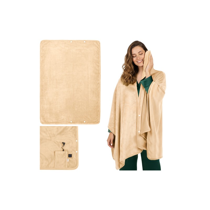 Mobilní elektrická zahřívací deka na záda 160×90 cm napájená z powerbanky. Měkká béžová, příjemná k pokožce, se 3 stupni ohřevu a jednoduchým ovládáním jedním tlačítkem - komfort doma, v práci i na cestách.