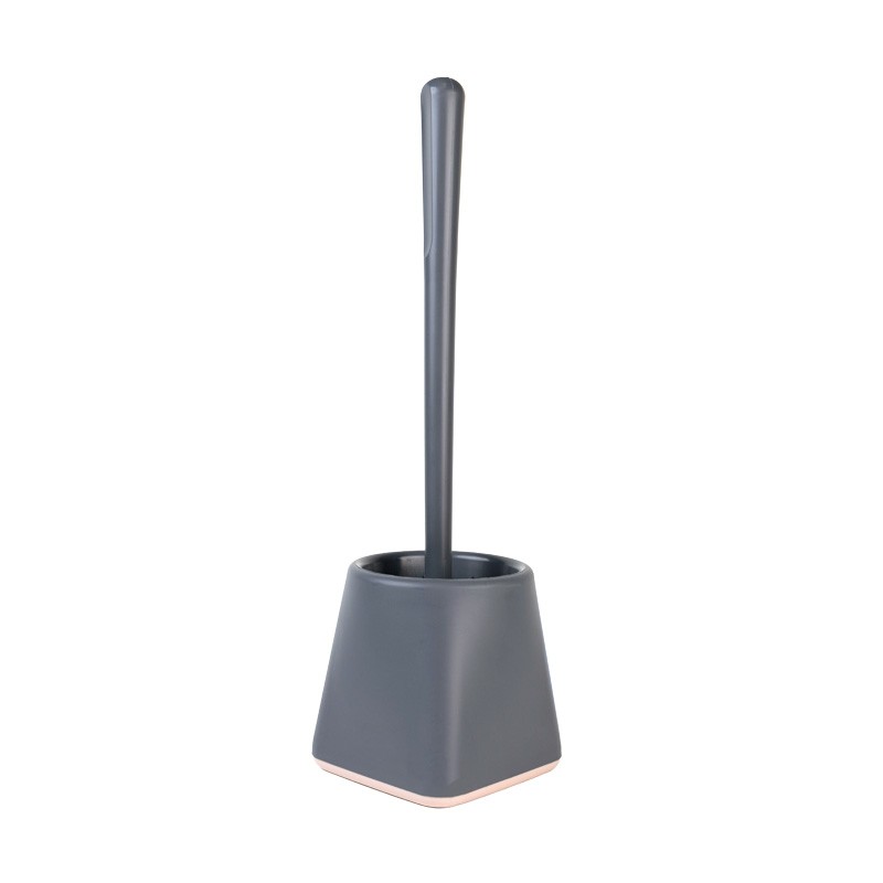 Šedá toaletní štětka s držákem, silikonovou hlavicí a plastovou rukojetí pro pohodlné každodenní použití v koupelně.