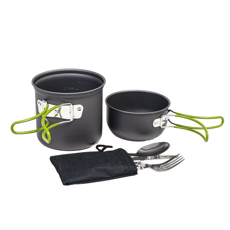 Sada turistického nádobí na vaření. Lehká, skladná a ideální na kempování - hrnec, pánev a příbor.