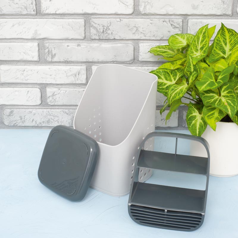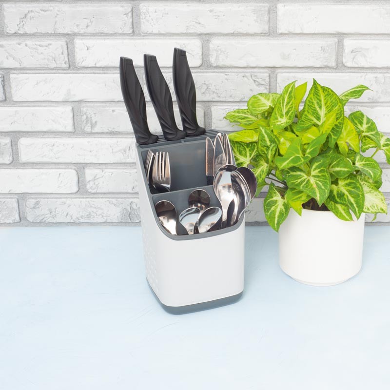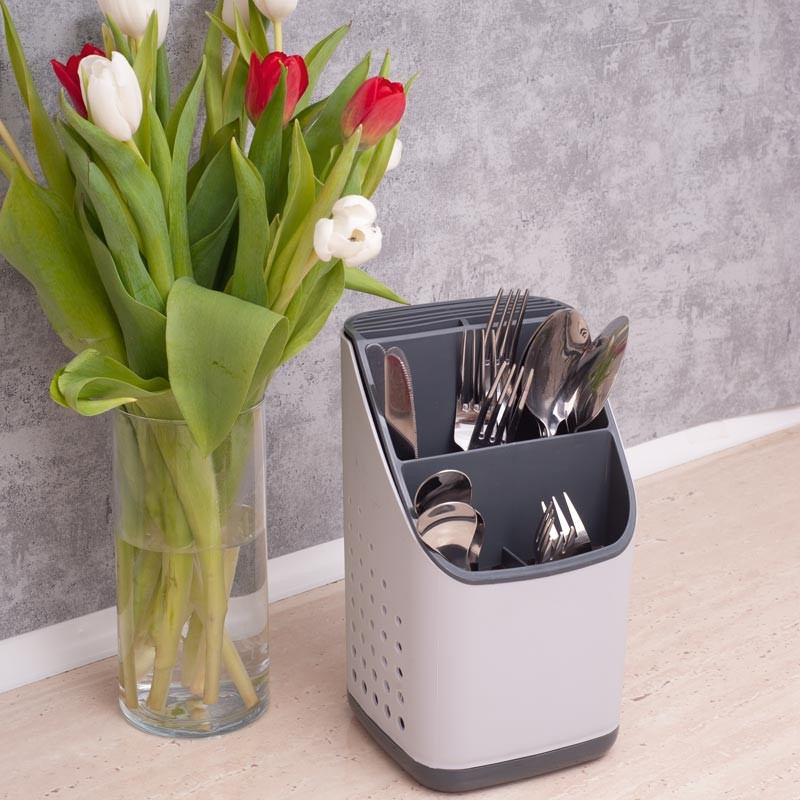 Má odnímatelný podstavec, do kterého odkapává voda - příbory nestojí ve vodě.