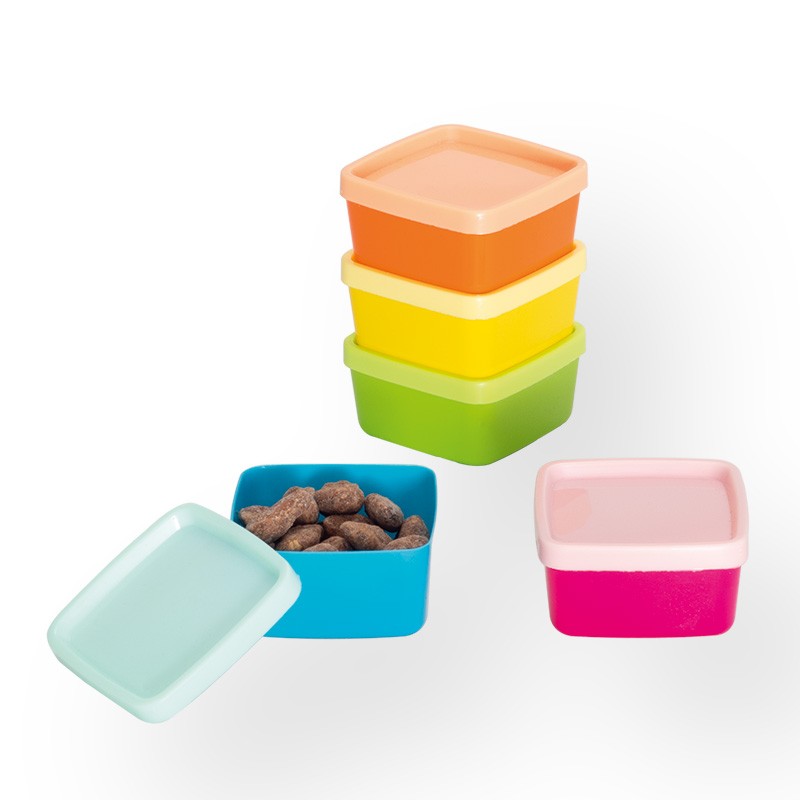 Sada 5 barevných krabiček je vhodná pro ukládání svačin a malých porcí. Malý objem jedné krabičky usnadňuje porcování a přípravu malých porcí na celý den.