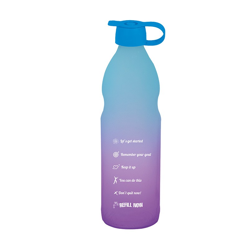 Stylová láhev na vodu ze skla v gradientních odstínech. Se stupnicí na jedné straně a vtipnými motivačními nápisy na druhé straně.