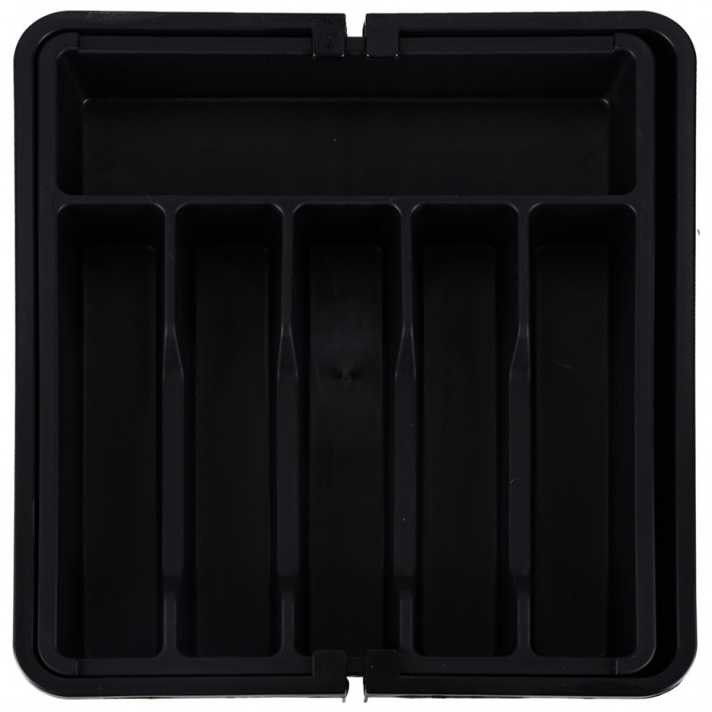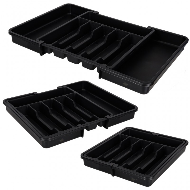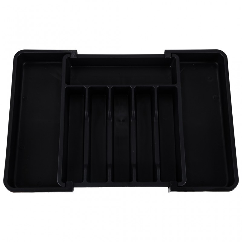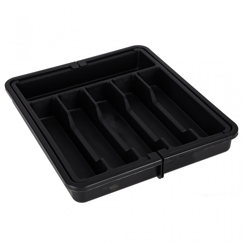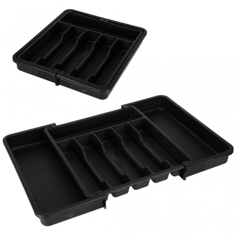 Rozšiřitelný, šířkově nastavitelný zásuvkový organizér na příbory s 8 přihrádkami z kvalitního plastu, který chrání vnitřek zásuvky a přizpůsobí se šířce 33–56,5 cm.