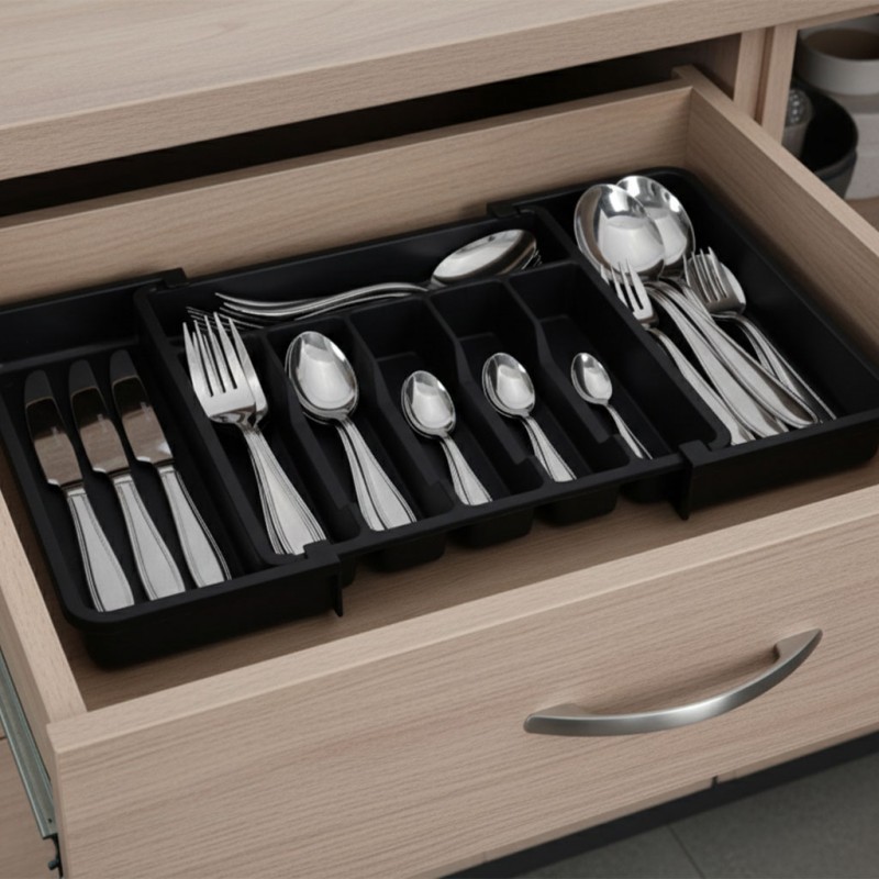 Tento rozšiřitelný organizér do kuchyňské zásuvky pomáhá udržet pořádek v příborech a kuchyňských pomůckách a zároveň maximálně využít dostupný prostor. Díky nastavitelné šířce se přizpůsobí zásuvkám různých rozměrů a 8 přihrádek umožňuje přehledné rozdělení příborů a drobného náčiní. Další přepážky poskytují místo pro kuchyňské doplňky, které dosud neměly své stálé uložení. Modulární řešení podporuje intuitivní organizaci kuchyně a zvyšuje komfort při každodenním vaření.