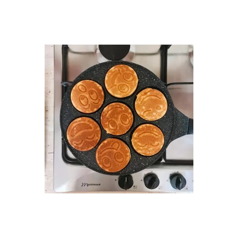 Pánev se 7 formami „emotikony“ na volská oka, lívance a pancakes - připravíš 7 porcí najednou bez přichytávání. Hodí se na všechny typy sporáků včetně indukce, má silné dno držící teplo, odnímatelnou rukojeť a lze ji mýt v myčce.