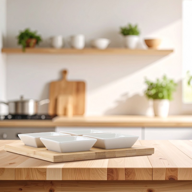 Elegantní sada pro servírování předkrmů se čtyřmi čtvercovými porcelánovými miskami a bambusovou deskou je stylovým řešením pro podávání dipů, omáček a drobných pochoutek při setkání u stolu.