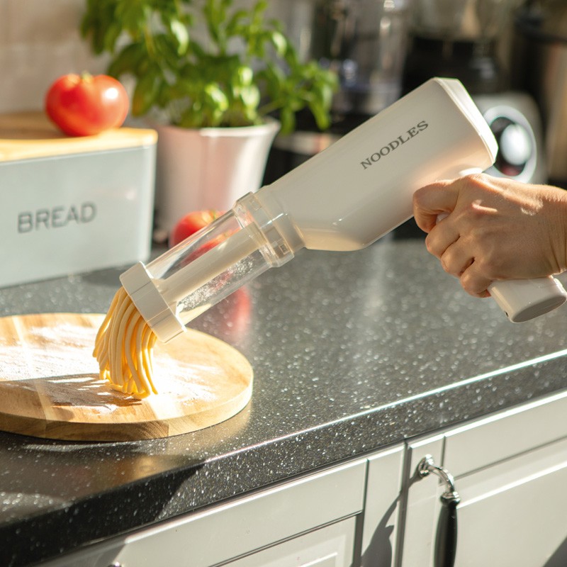 Strojek na těstoviny 5v1 s akumulátorem umožňuje rychlou přípravu domácích těstovin a vytváření různých tvarů díky pěti nástavcům.