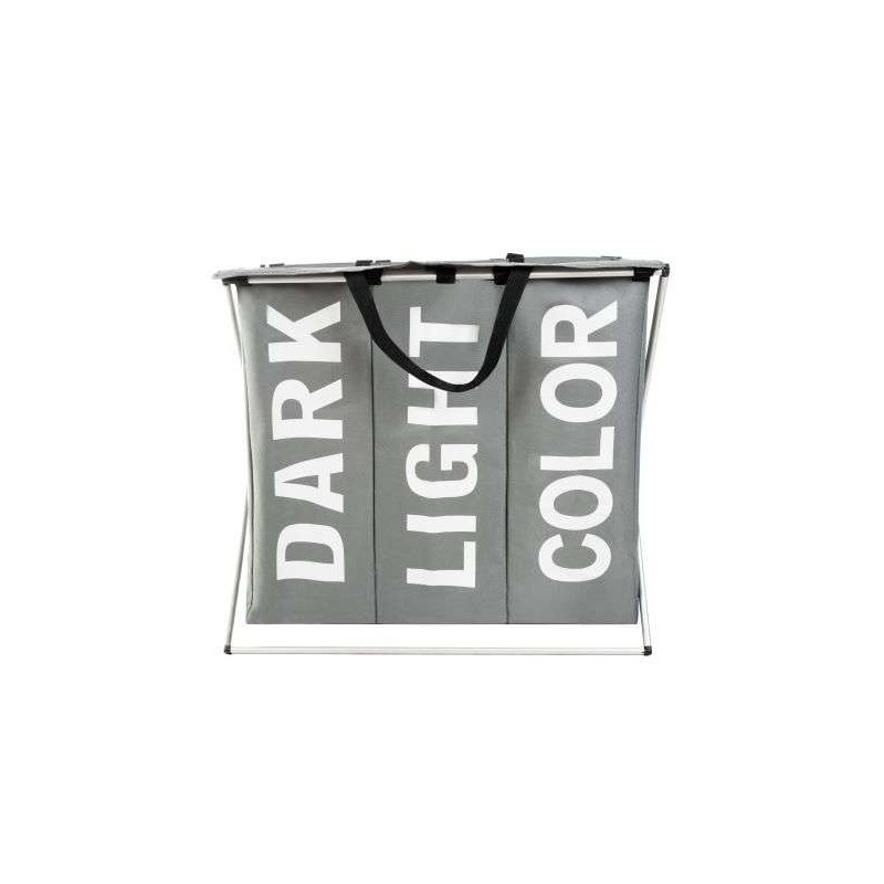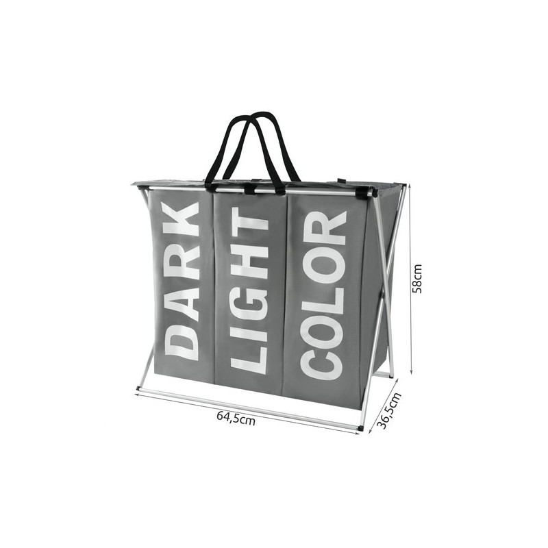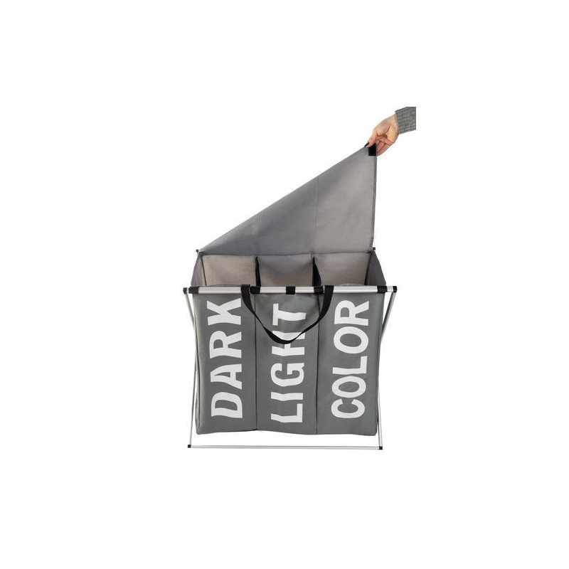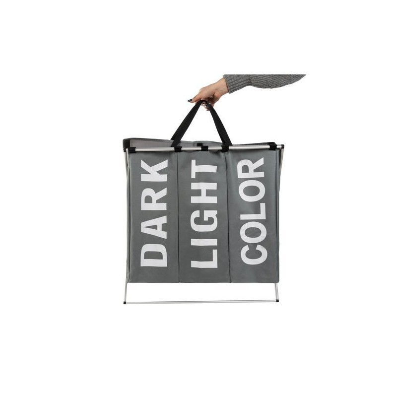Tříkomorový koš na prádlo s objemem cca 130 l, voděodolnou vnitřní vrstvou, víkem na suchý zip a uchyty pro snadné přenášení a třídění prádla.