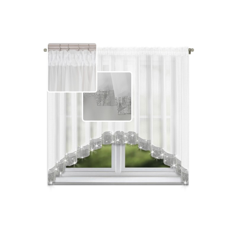 Sněhově bílá barva v kombinaci se stříbrným leskem kamínků působí nadčasově a elegantně. Záclona prosvětluje interiér a přidává mu lehkost, zároveň však zdůrazňuje reprezentativní charakter místnosti. Styl je univerzální - dobře ladí s moderním, glamour a minimalistickým zařízením, ale i s klasickými interiéry, kde má hlavní roli detail a čisté linie.