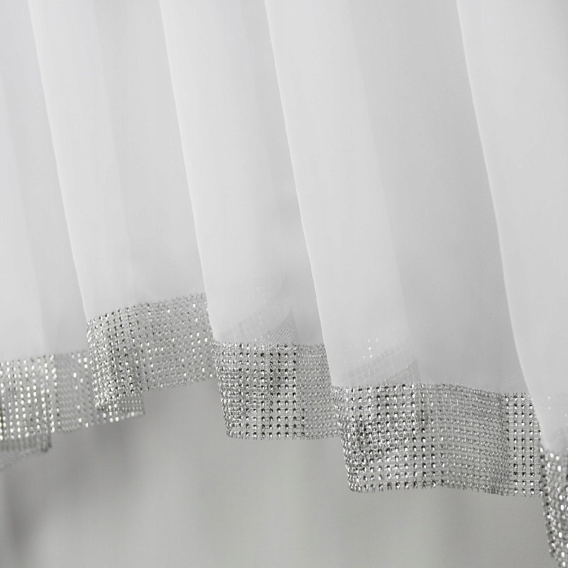 Bílá voálová záclona glamour se stříbrnými kamínky na spodním okraji, v rozměru 400 x 150 cm, z páskou na řasení a více možnostmi zavěšení, z kvalitního polyesteru pro snadnou údržbu.