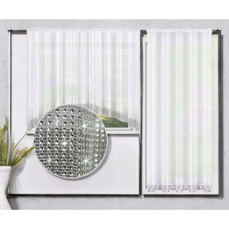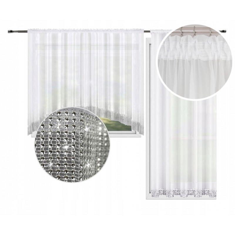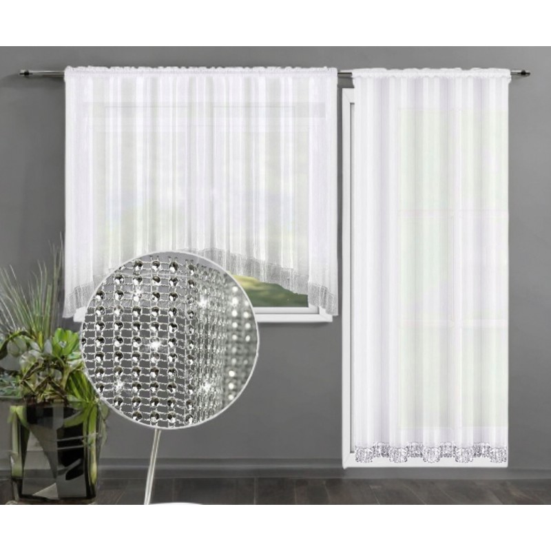 Sněhově bílý voál interiér prosvětluje a snadno se kombinuje s různými styly zařízení. Dekorativní pruh stříbrných kamínků na spodním okraji dodává celku luxusní, ale přitom decentní charakter. Sada vytváří elegantní a harmonický rám pro okno a balkon, který podtrhne glamour, moderní i klasický styl bez toho, aby prostor opticky zatěžoval.
