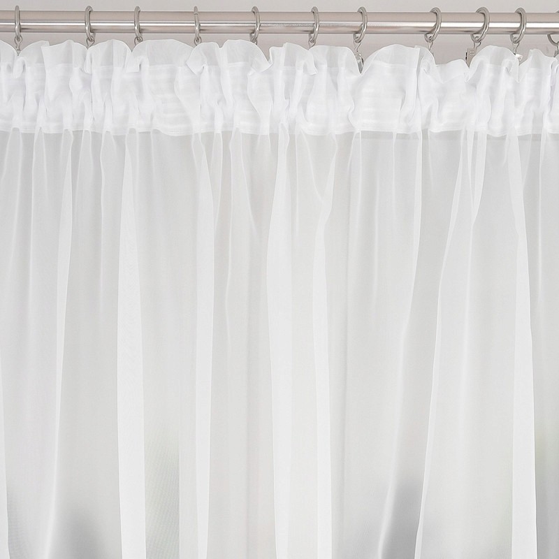 Stylová sada balkonových záclon z bílého voálu je hotová dekorace pro velké okno a balkonové dveře. Lehká a vzdušná tkanina krásně propouští a rozptyluje světlo, díky čemuž místnost působí světleji, opticky větší a útulnější. Jemný pruh stříbrných kamínků na spodním okraji dodává aranžmá elegantní lesk, který vypadá dobře ve dne i večer. Sada je ideální do obývacího pokoje s balkonem a hodí se do moderních, glamour i klasických interiérů. Díky hotovému řešení rychle vytvoříte sladěnou, reprezentativní dekoraci celé okenní stěny.