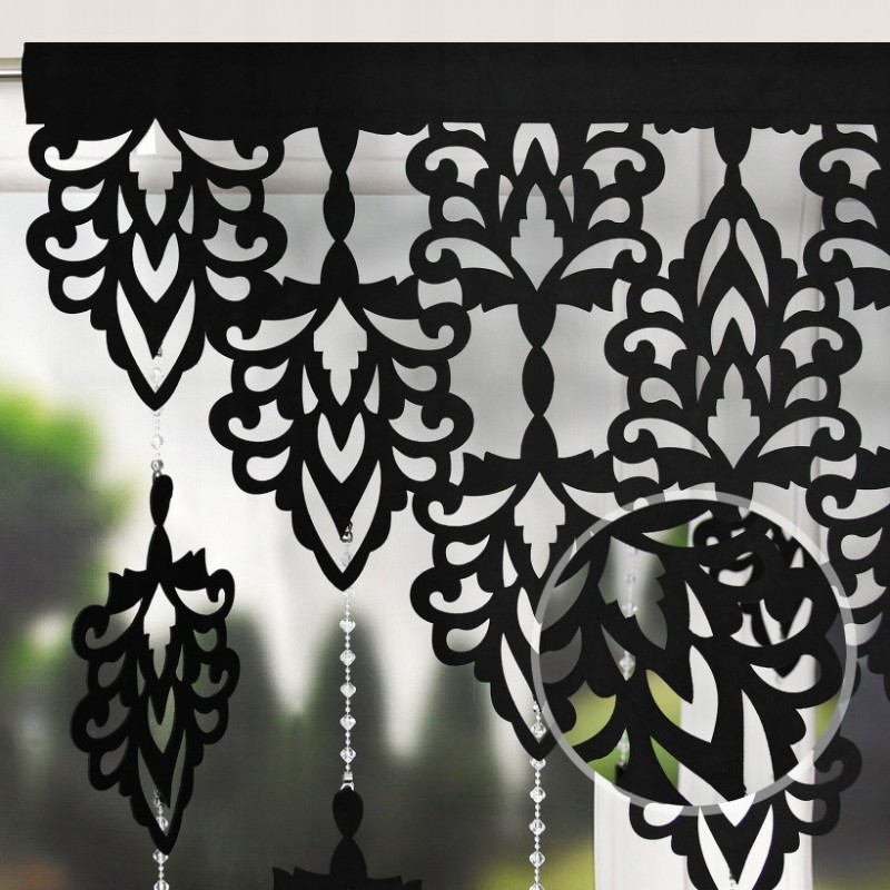 Černý filcový okenní panel 100x150 cm s ažurovými listy a korálky, ve vysoké kvalitě, snadno zavěsitelný na tyčovou garnýž nebo na žabky.