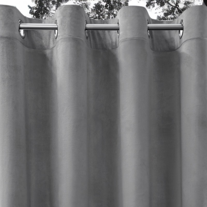 Světle šedá barva dodává závěsu moderní, elegantní výraz a přináší do interiéru klid a harmonii. Velurová struktura podporuje glamour styl a dělá z textilie výrazný dekorativní prvek. Závěs se hodí jak do moderních, tak i klasických interiérů a stane se vkusným doplňkem obývacího pokoje, ložnice nebo elegantní pracovny.