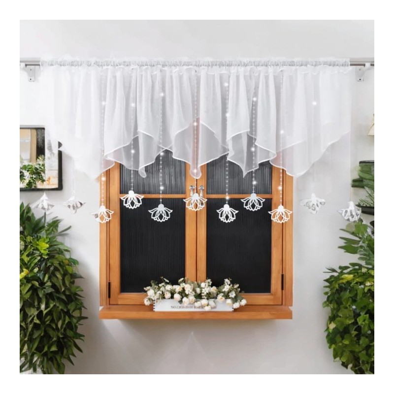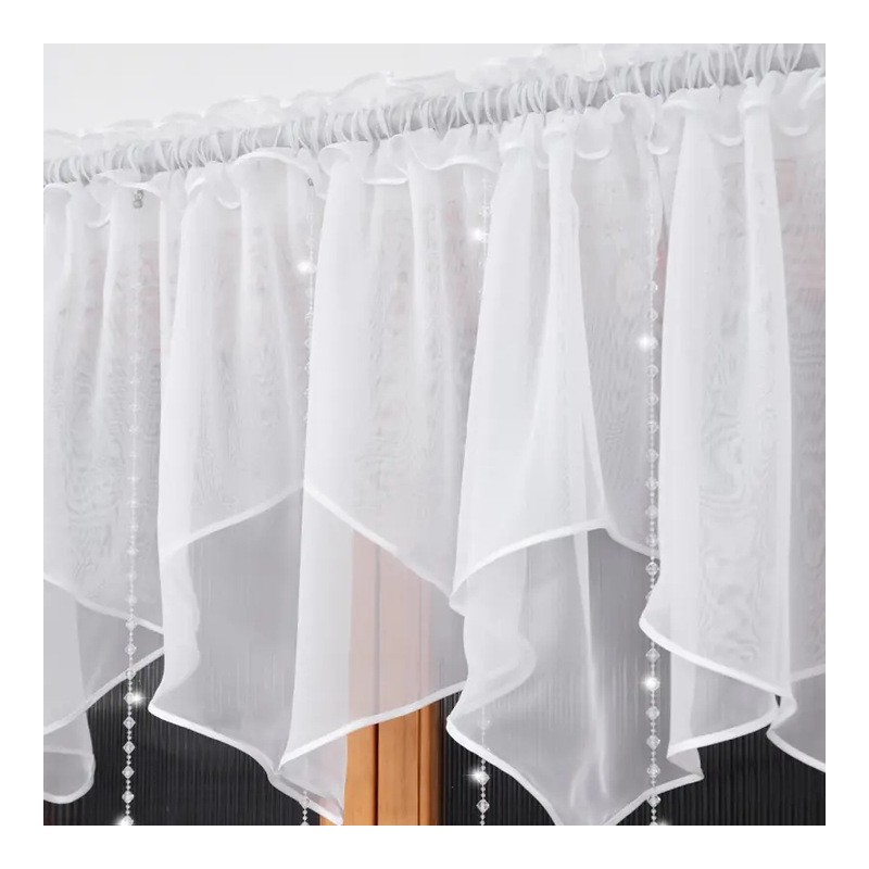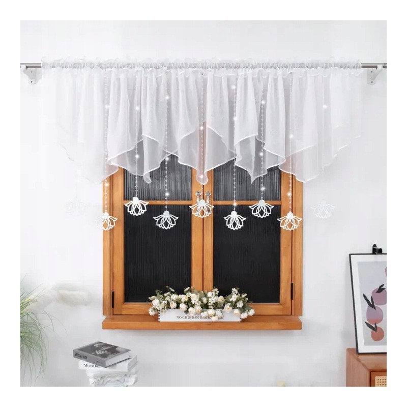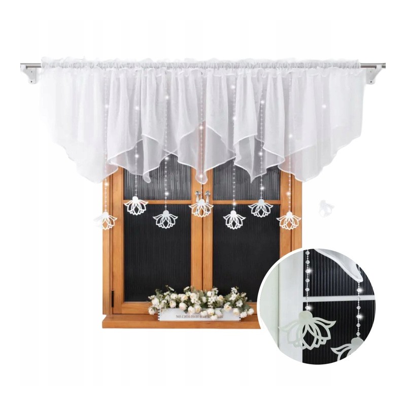Krátká dekorativní záclona ze sněhově bílého voálu s bílými plstěnými závěsky. Jemně zastíní okno, propouští denní světlo a dodá interiéru lehkost i eleganci. Vzhledem k výrobnímu procesu je dodací lhůta delší.