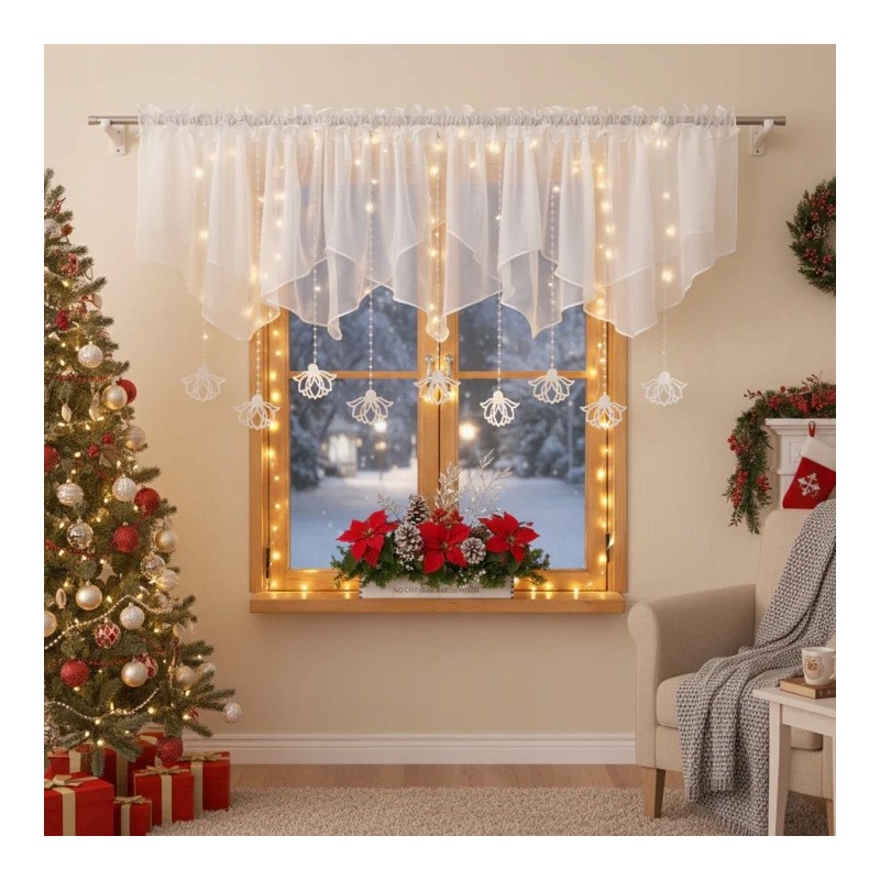 Dekorativní panel s bílými plstěnými závěsky a sněhově bílý voál vytvářejí jemný, ale výrazný detail na okně.