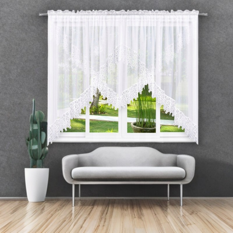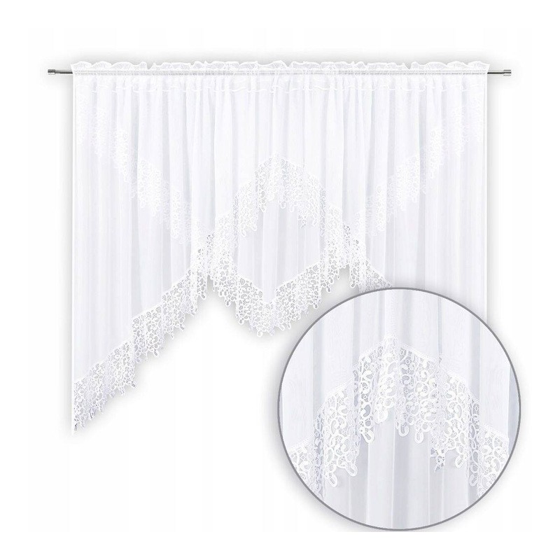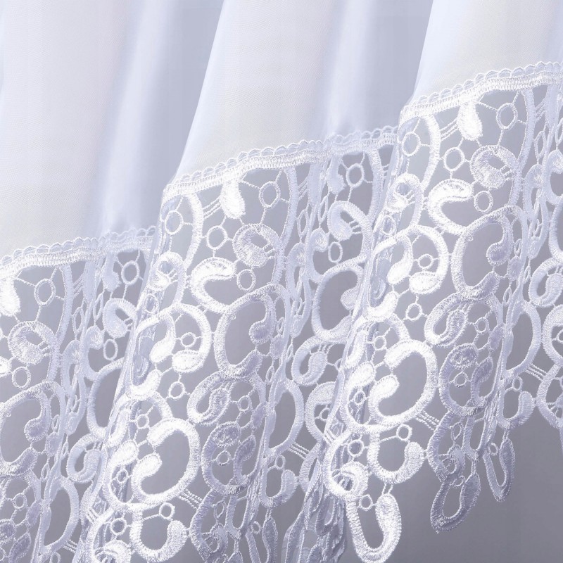 Dvouvrstvá bílá záclona se širokou ozdobnou krajkou (gipiurou) pro elegantní a výraznou dekoraci okna. Jemný voál decentně rozptyluje světlo a univerzální bílá se hodí do každého interiéru. Vzhledem k výrobnímu procesu je dodací lhůta delší.