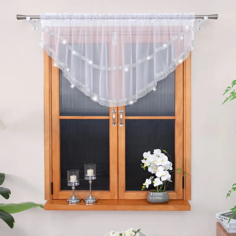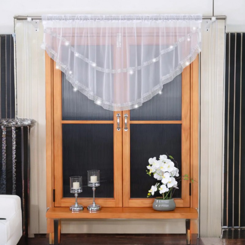Bílá barva a transparentní voál vytvářejí jemnou, elegantní dekoraci okna. Zirkony dodávají decentní lesk a tvar půlkruhu propojuje klasiku s moderním akcentem.