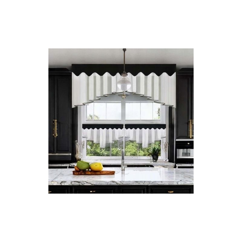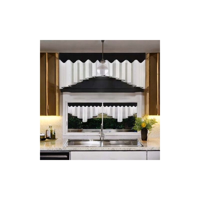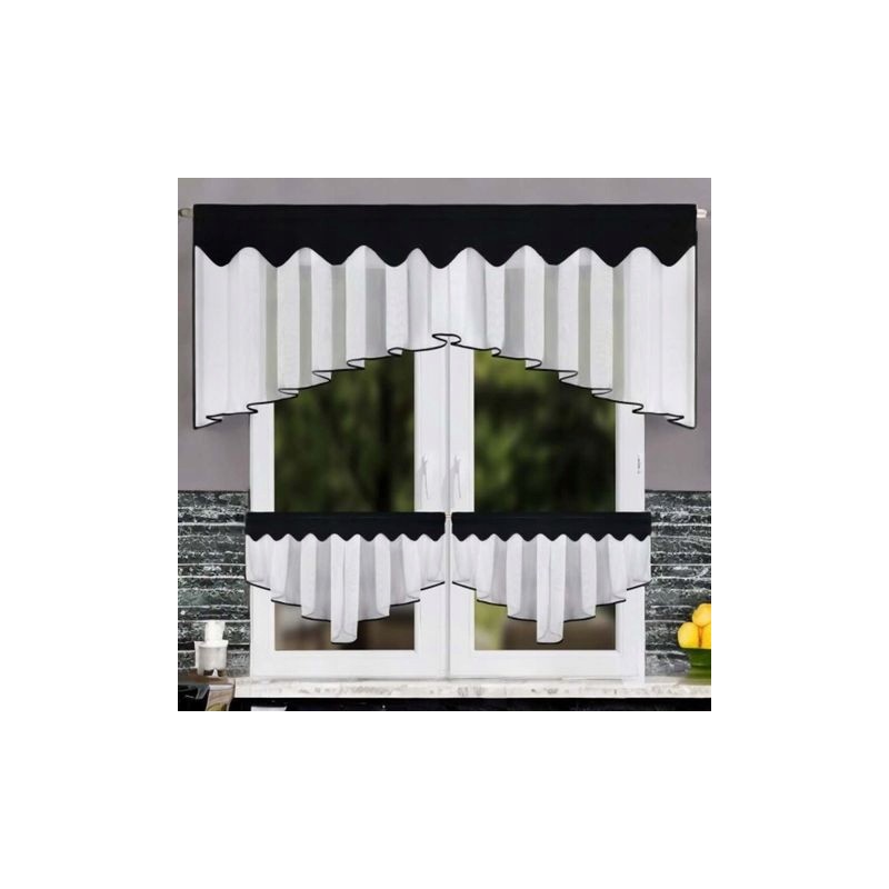 Elegantní kuchyňský set: voálová záclona 200x80 cm a vitrážky 90x50 cm, doplněné černým lemováním. Zútulní interiér, jemně filtruje světlo a pomáhá zachovat soukromí, zatímco decentní vzor dodá oknu charakter. Vzhledem k výrobnímu procesu je dodací lhůta delší.