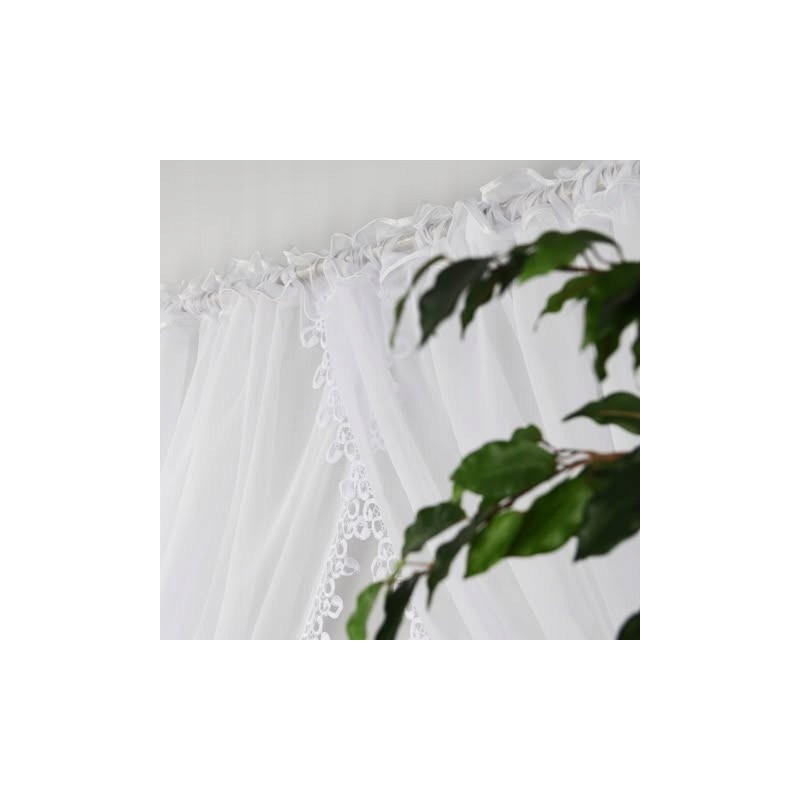 Elegantní voálová záclona v bílé barvě s dekorativní krajkou 400x150 cm. Jemně rozptyluje světlo, dodá interiéru lehkost a nadčasový styl a všitá páska umožní rychlé zavěšení. Vzhledem k výrobnímu procesu je dodací lhůta delší.