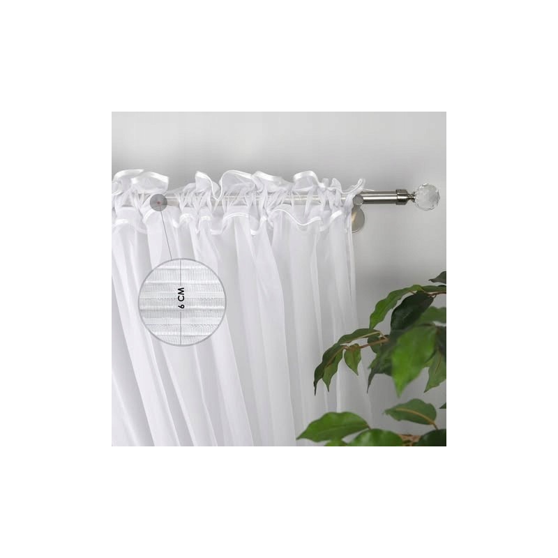 Záclona je z voálu. Složení: 100% polyester. Všitá páska usnadňuje zavěšení a pomáhá k úhlednému, estetickému uložení. Montáž je možná do tunýlku i pomocí žabek nebo háčků.