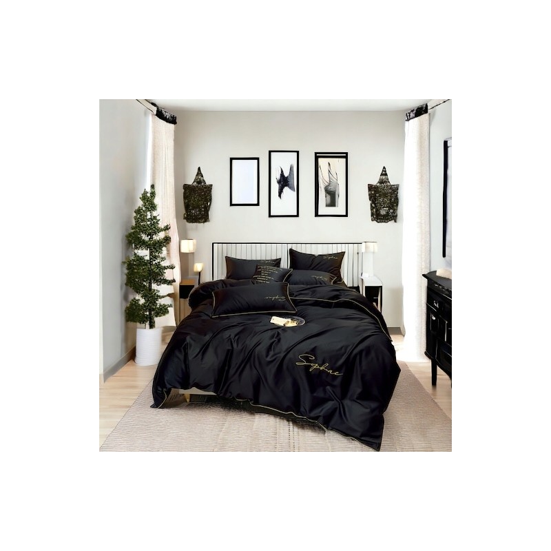 Třídílná sada ložního povlečení z mikrovlákna 160x200 cm v černé barvě, zdobená výšivkou a elegantní lemovkou. Měkká, prodyšná a hypoalergenní, snadná na údržbu – se zapínáním na zip, rychle schne a drží výrazné barvy i po praní.