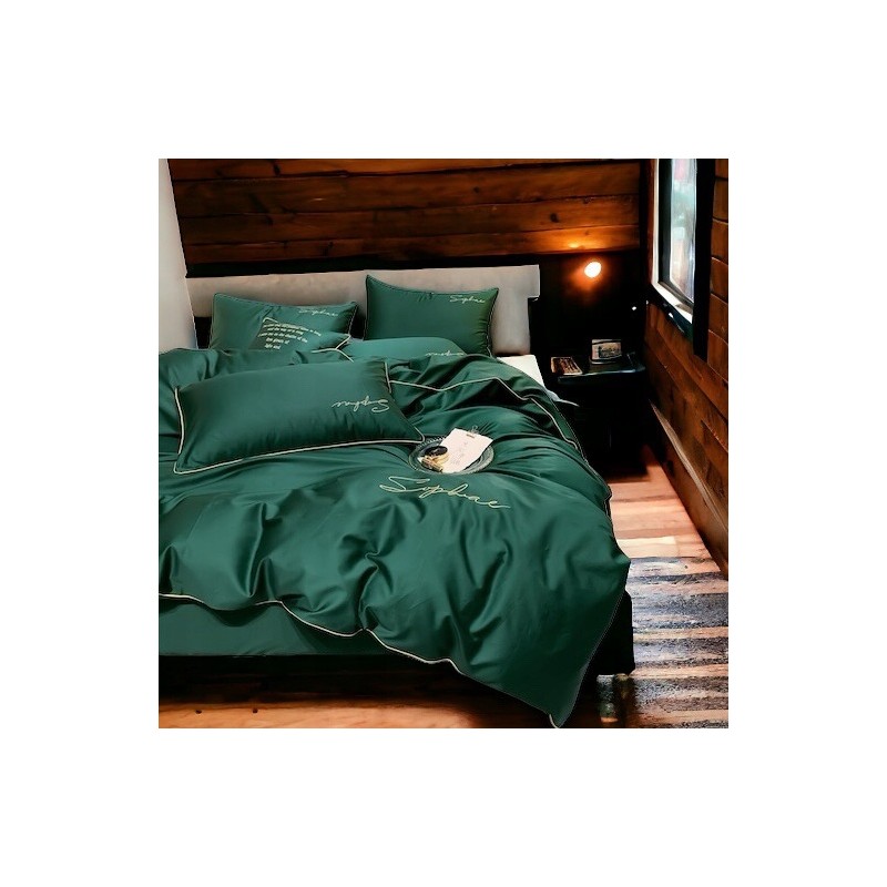 Luxusní sada povlečení z mikrovlákna 200x220 cm v zelené barvě, zdobená elegantní výšivkou a lemováním. Měkká, prodyšná a hypoalergenní, snadná na údržbu, se zapínáním na zip – pohodlí a styl každý den.