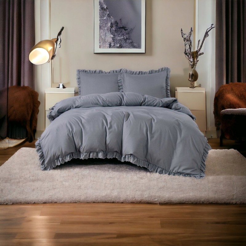 Módní sada povlečení s volánky 160x200 cm v tmavě šedé barvě. Měkké mikrovlákno je příjemné na dotek, prodyšné, nemačká se a rychle schne, a zapínání na zip usnadňuje každodenní převlékání. Vzhledem k výrobnímu procesu je dodací lhůta delší.