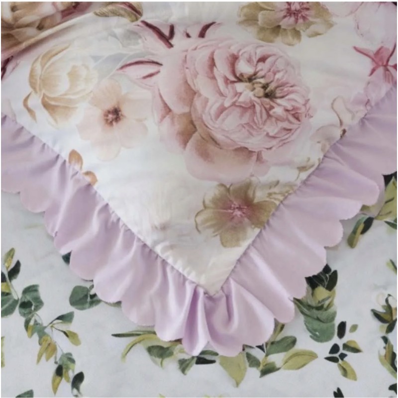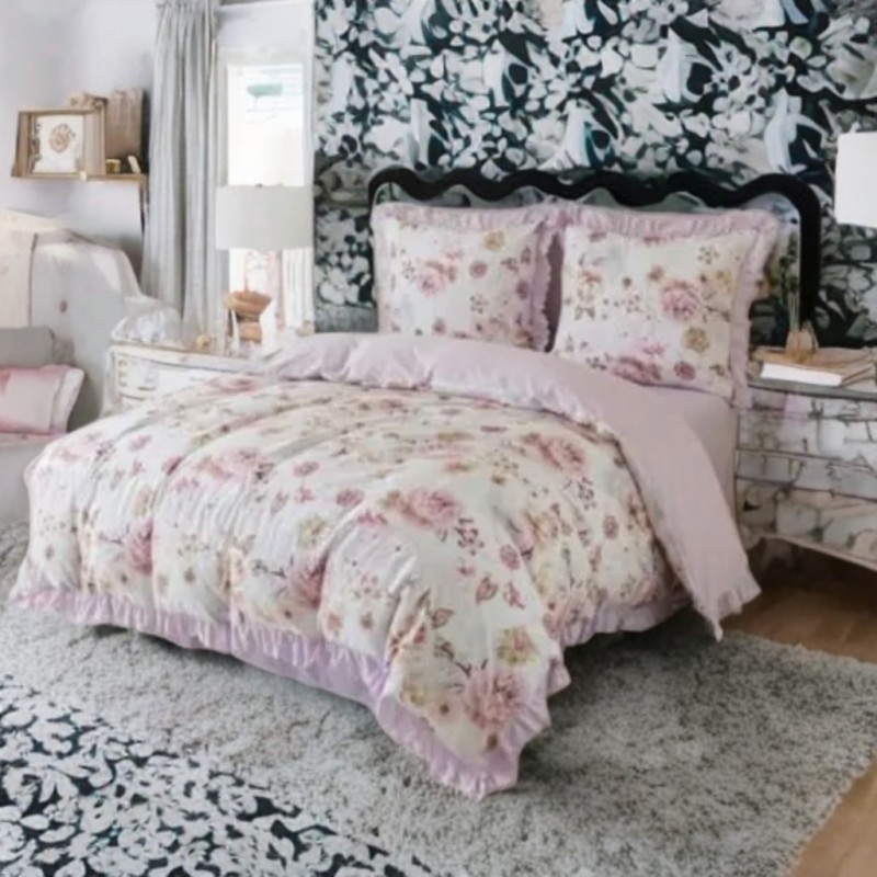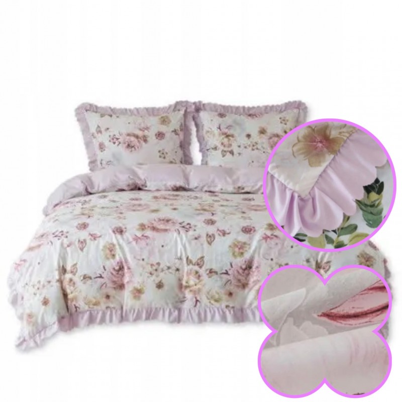 Volánky a růžový květinový motiv vytvářejí dekorativní efekt, který zvýrazní postel a osvěží ložnici.
