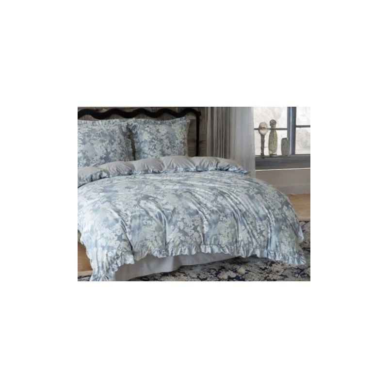 Volánky a šedo-modrý květinový motiv vytvářejí dekorativní efekt, který zvýrazní postel a osvěží ložnici.