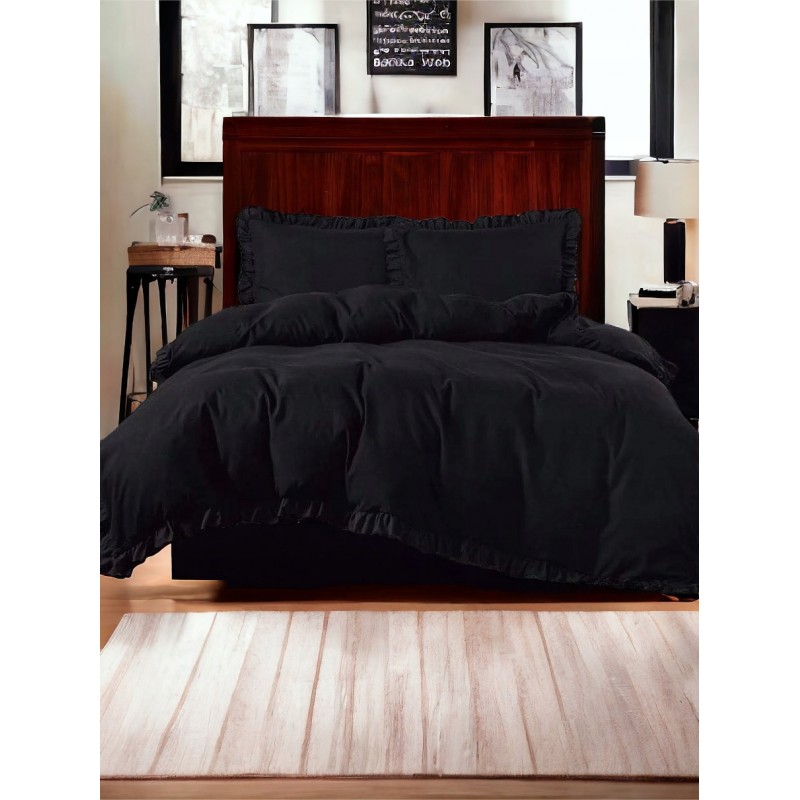Módní sada povlečení s volánky 200x220 cm v černé barvě. Měkké mikrovlákno je příjemné na dotek, prodyšné, nemačká se a rychle schne, a zapínání na zip usnadňuje každodenní převlékání. Vzhledem k výrobnímu procesu je dodací lhůta delší.