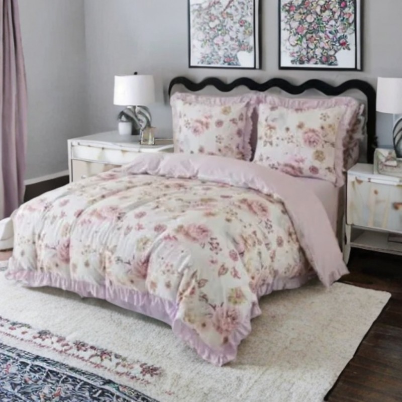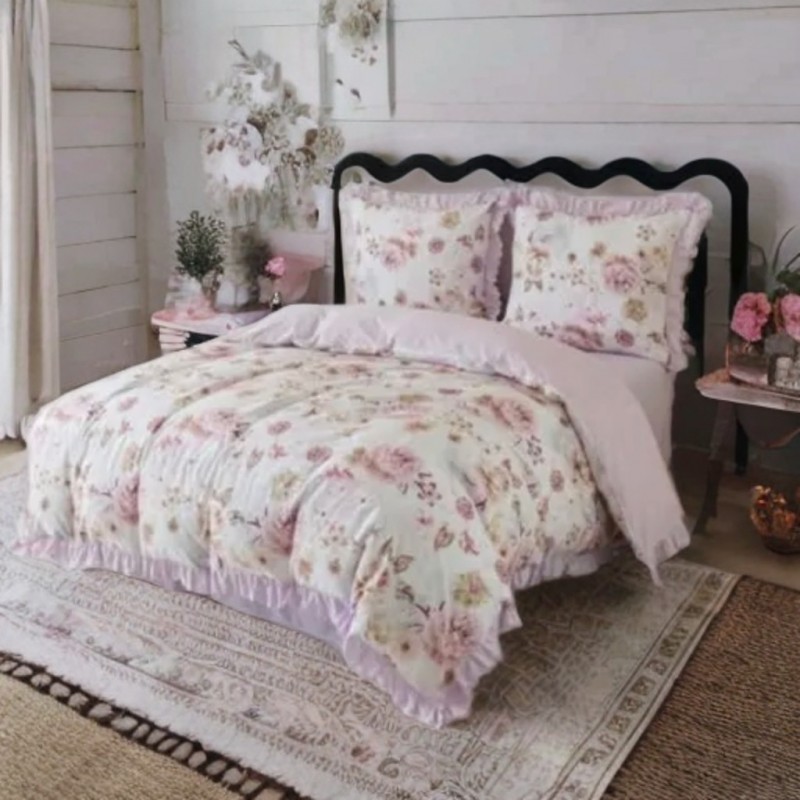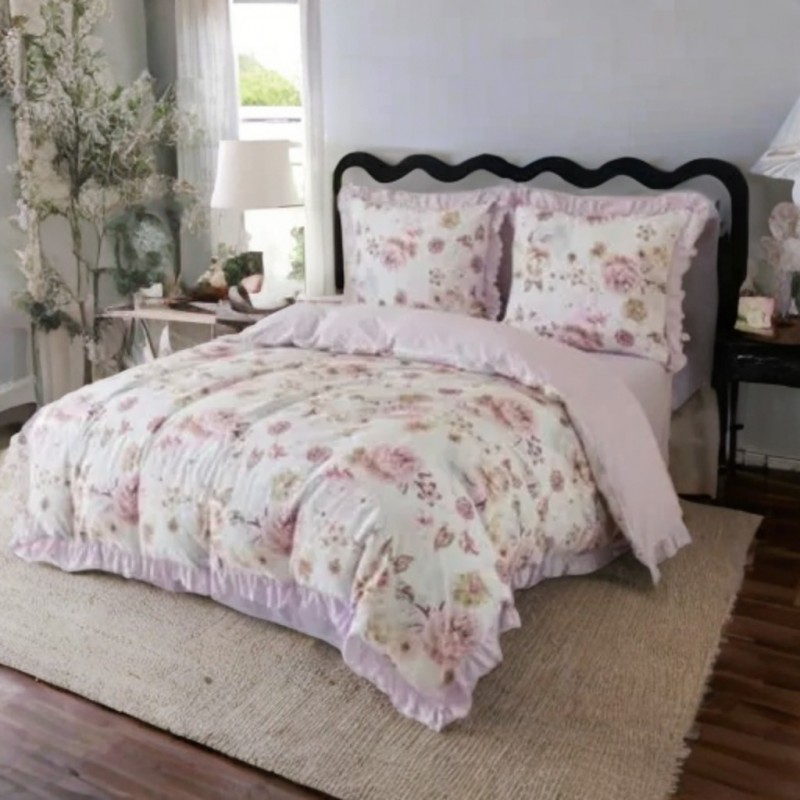Volánky a růžový květinový motiv vytvářejí dekorativní efekt, který zvýrazní postel a osvěží ložnici.