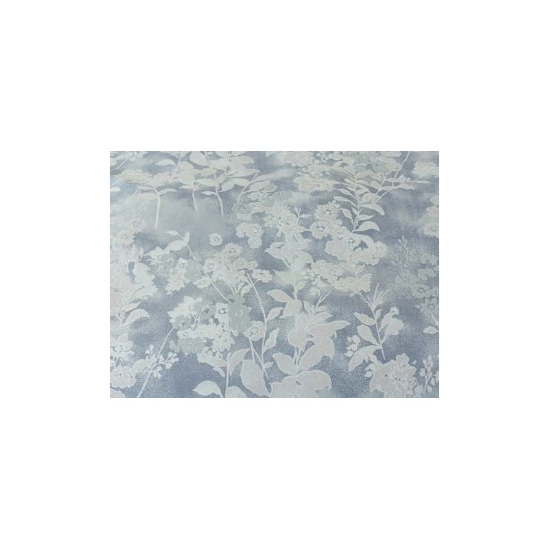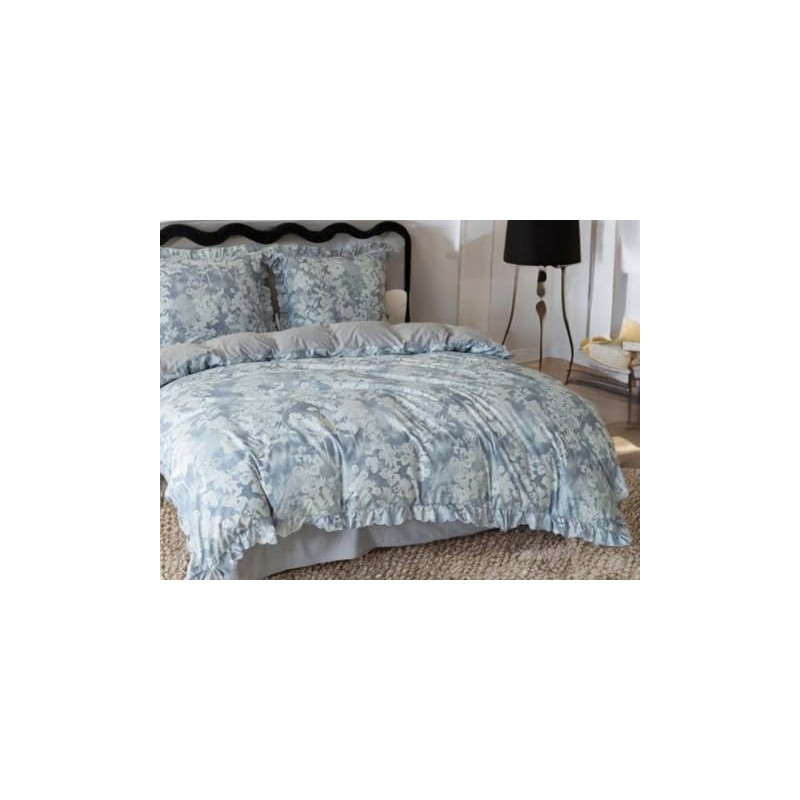 Volánky a šedo-modrý květinový motiv vytvářejí dekorativní efekt, který zvýrazní postel a osvěží ložnici.