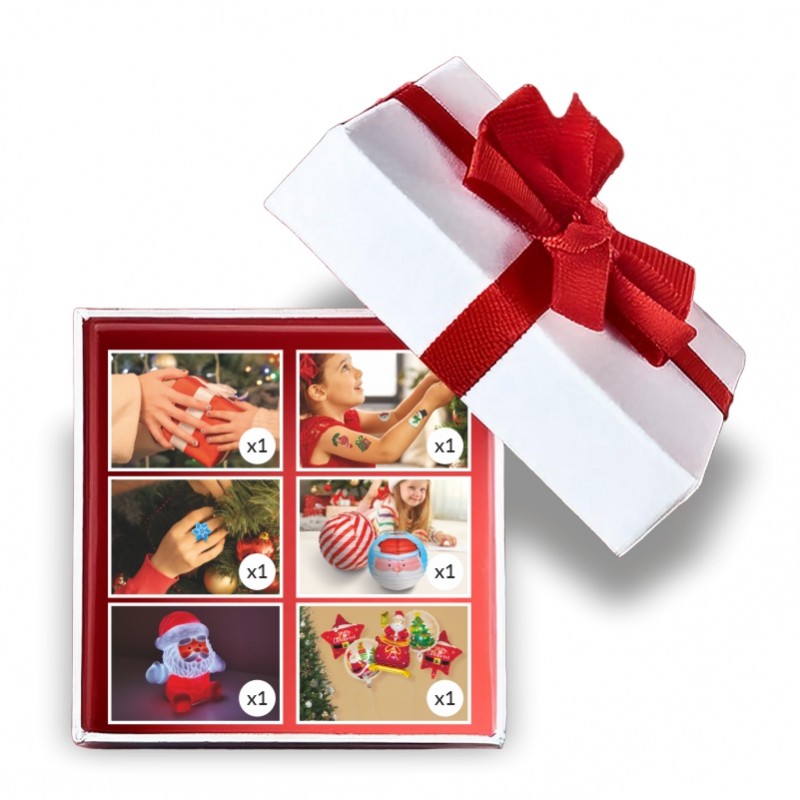 Box obsahuje samolepky na nehty, fluorescenční tetování, svítící prstýnek, vánoční koule, lampičku Santa a sadu 5 vánočních balónků.