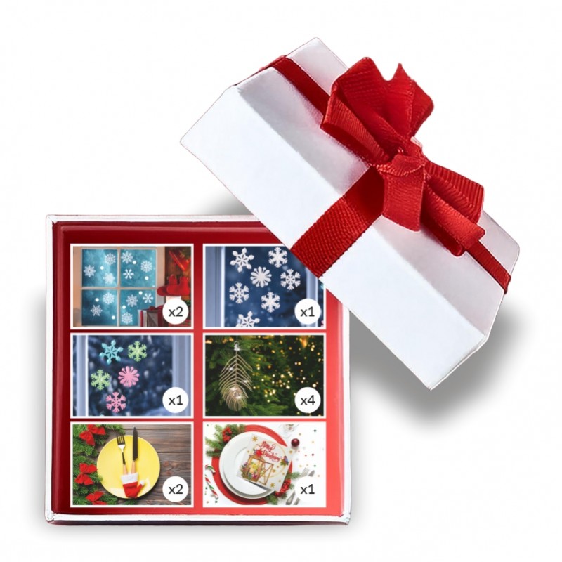 Box zahrnuje zlaté pírko, bílé samolepky vloček, fluorescenční vločky, obaly na příbory, čepici Santa a vánoční ubrousky Merry Christmas. Podrobné informace o materiálech a provedení jednotlivých dekorací najdeš u produktu.